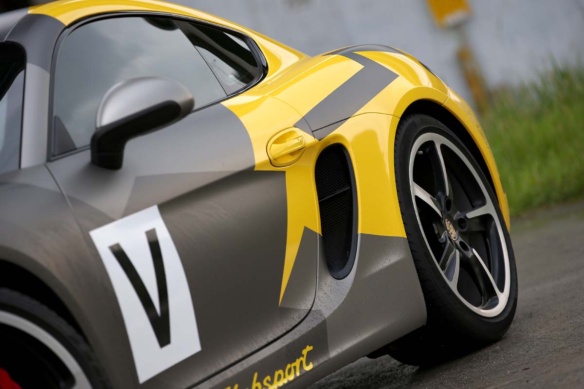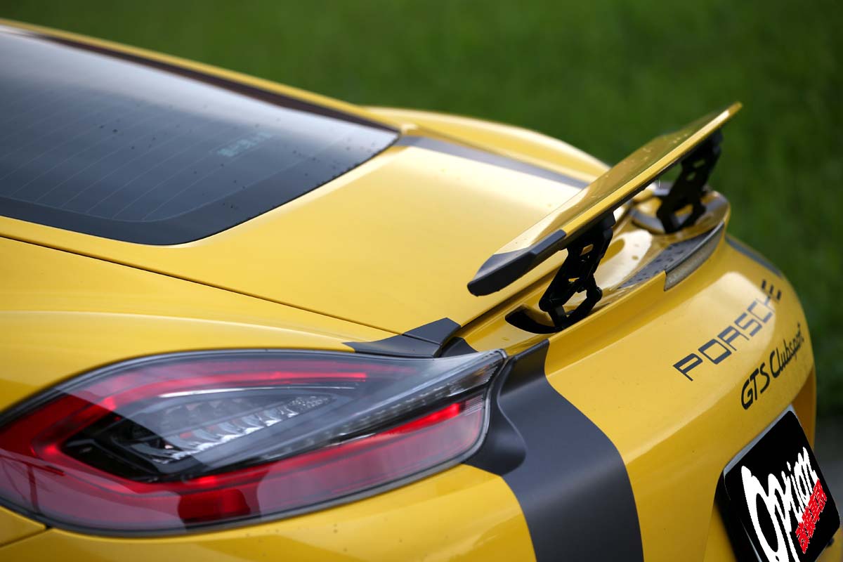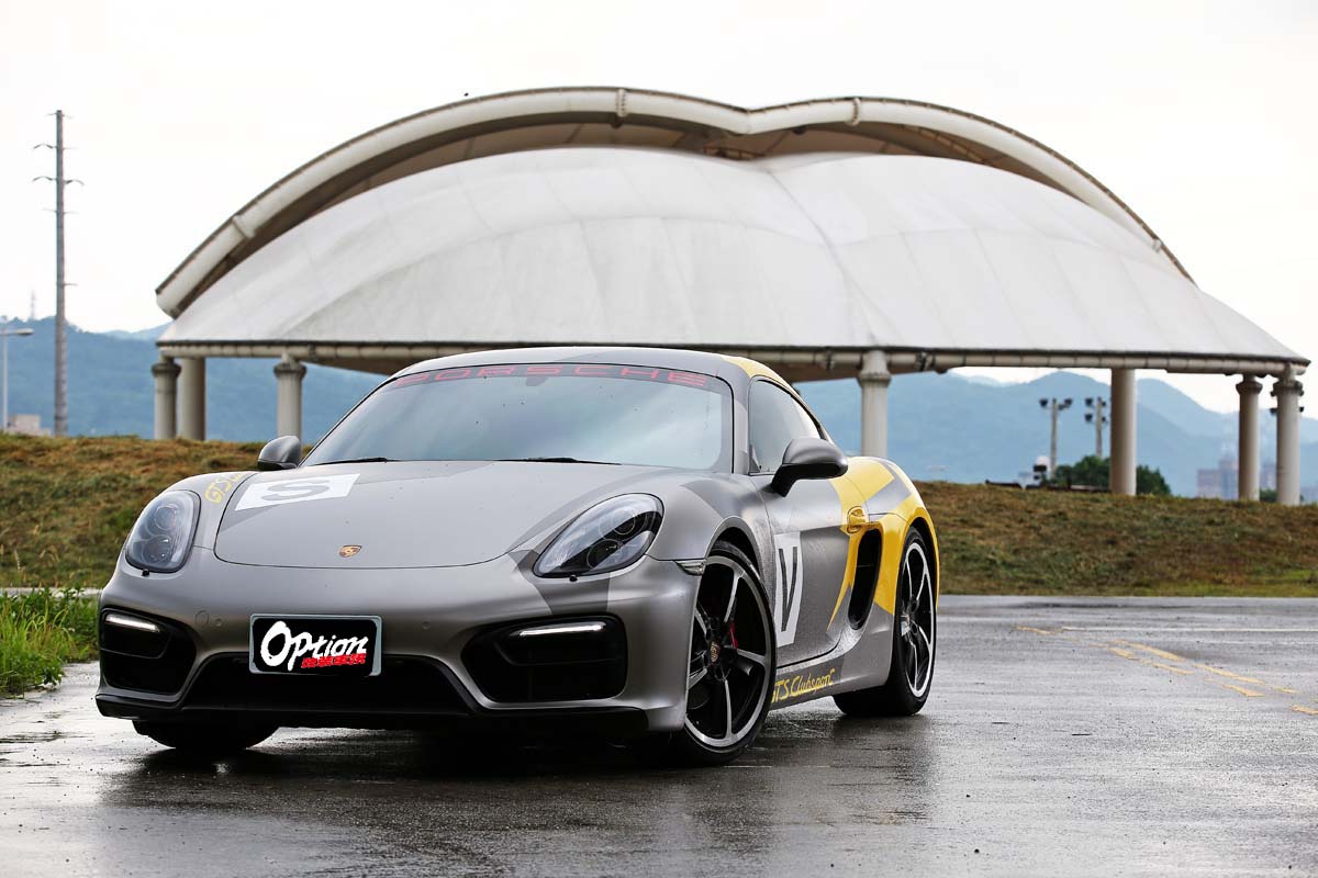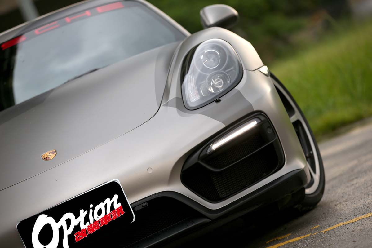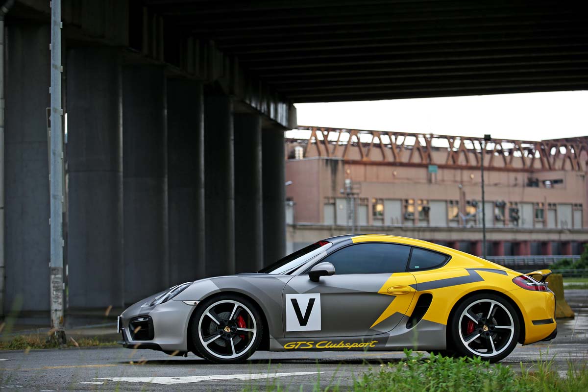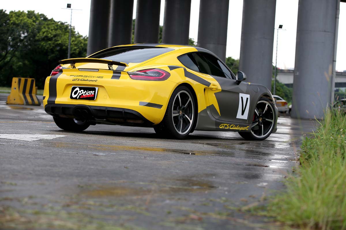 | 原本就頗具跑格的Cayman,在貼上仿Cayman GT4 Clubsport廠車的彩繪貼膜後,整體氣勢更高漲,絕對是路上的目光吸引機。 |