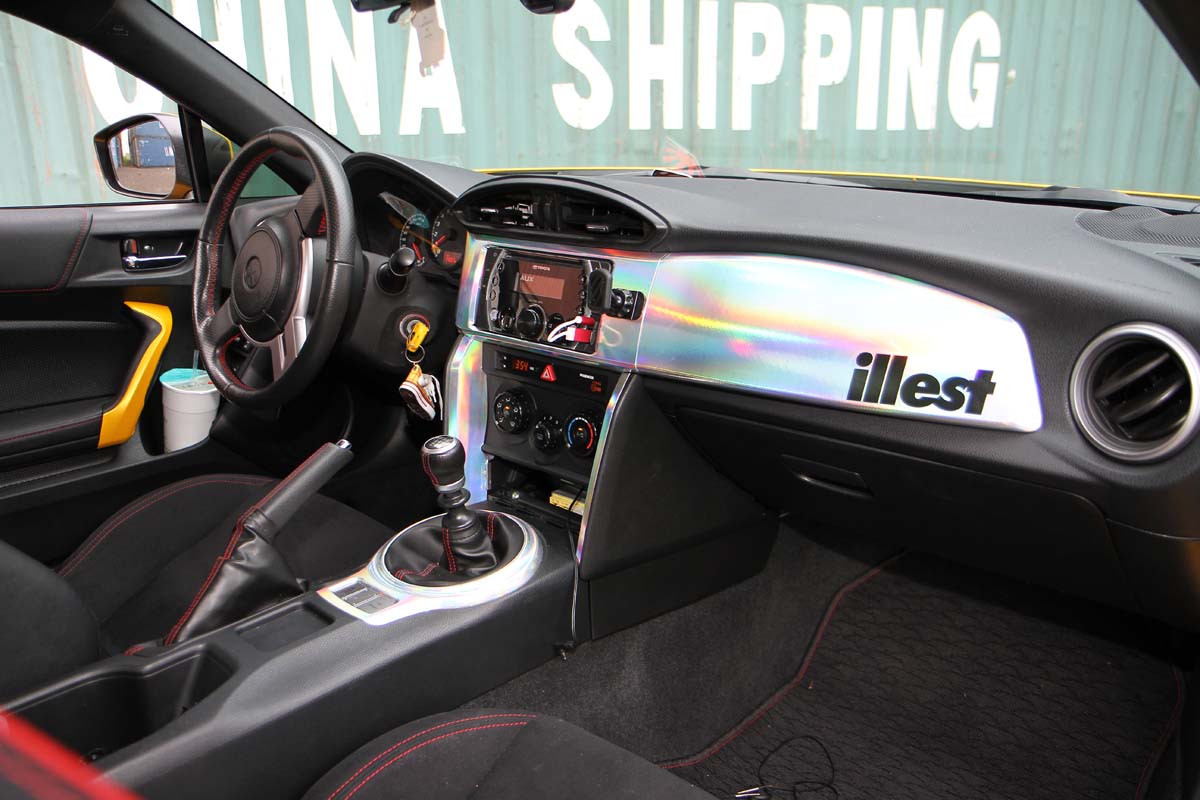 事實上,該車主-洪正一本身還是中部-緊繃彩貼包膜店的掌門人,打造這部寬體86也是希望能藉此打響知名度,而為凸顯自家技術,全車還貼上亮黃色貼膜,細心施工的手法,很多細接縫與收邊都處理得相當細膩,貼膜的手法同樣純熟,加上車側各大改裝品牌的Logo字體,使其開在路上想不被注意到都很難。車內部分,為了凸顯86的性能本位,車主特別針對中控檯飾板與排檔座等,貼上幻彩電鍍膜,該膜料可隨著觀看角度的移動,產生七彩變化,加上底色為銀色,讓人看得心炫神迷,相當好看。目前這部車外觀部分的貼膜,不含字體建議售價約為5-6萬元(視車體大小與難度),施工時間為一周,提供給大家參考。