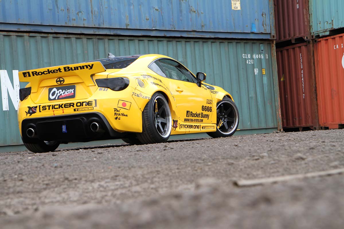 Toyota 86/Subaru BRZ/ Scion FR-S,這三輛掛著不同品牌、骨子裡血脈幾乎完全相同的後驅小跑車,從推出至今全球各地改裝品牌,都相當積極開發相關的改裝套件,而日本知名寬體品牌-Rocket Bunny,也特別針對此車設計一套寬體空力套件,車頭部分,包含了低伸的前下擾流、開孔引擎蓋與寬體葉子板等,前下擾流板可直接安裝於原廠前保桿下方,不須整支前保桿都換掉就可安裝,前後寬體葉子板安裝時須切割部分葉子板邊緣,然後再透過鉚釘固定於原廠葉子板上,一整排鉚釘造型除了可讓人知道葉子板已換成寬體式樣外,外露輪胎的設計,更使其充滿廠車氣勢的氛圍,讓車側多了許多性能氣息,而這部86的車主也是看到其改造魅力,忍痛切割鈑金,讓愛車擁有寬體化的外型。
