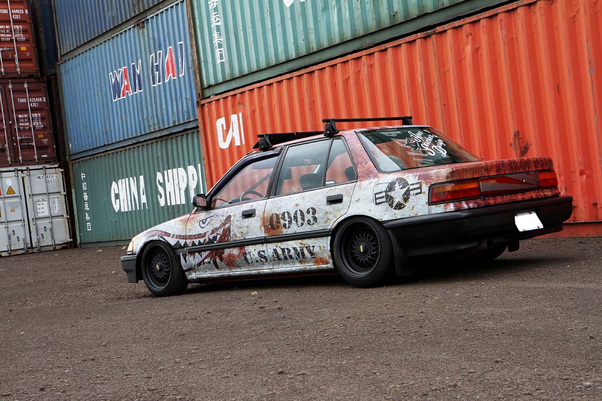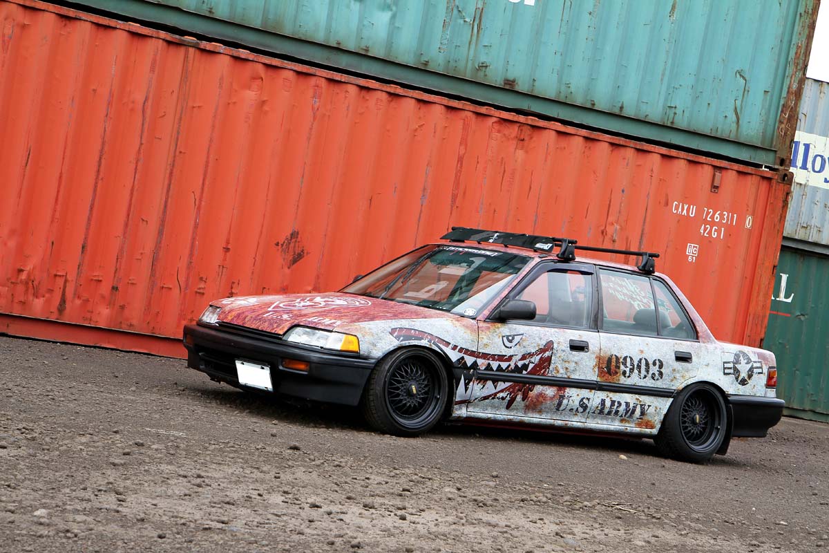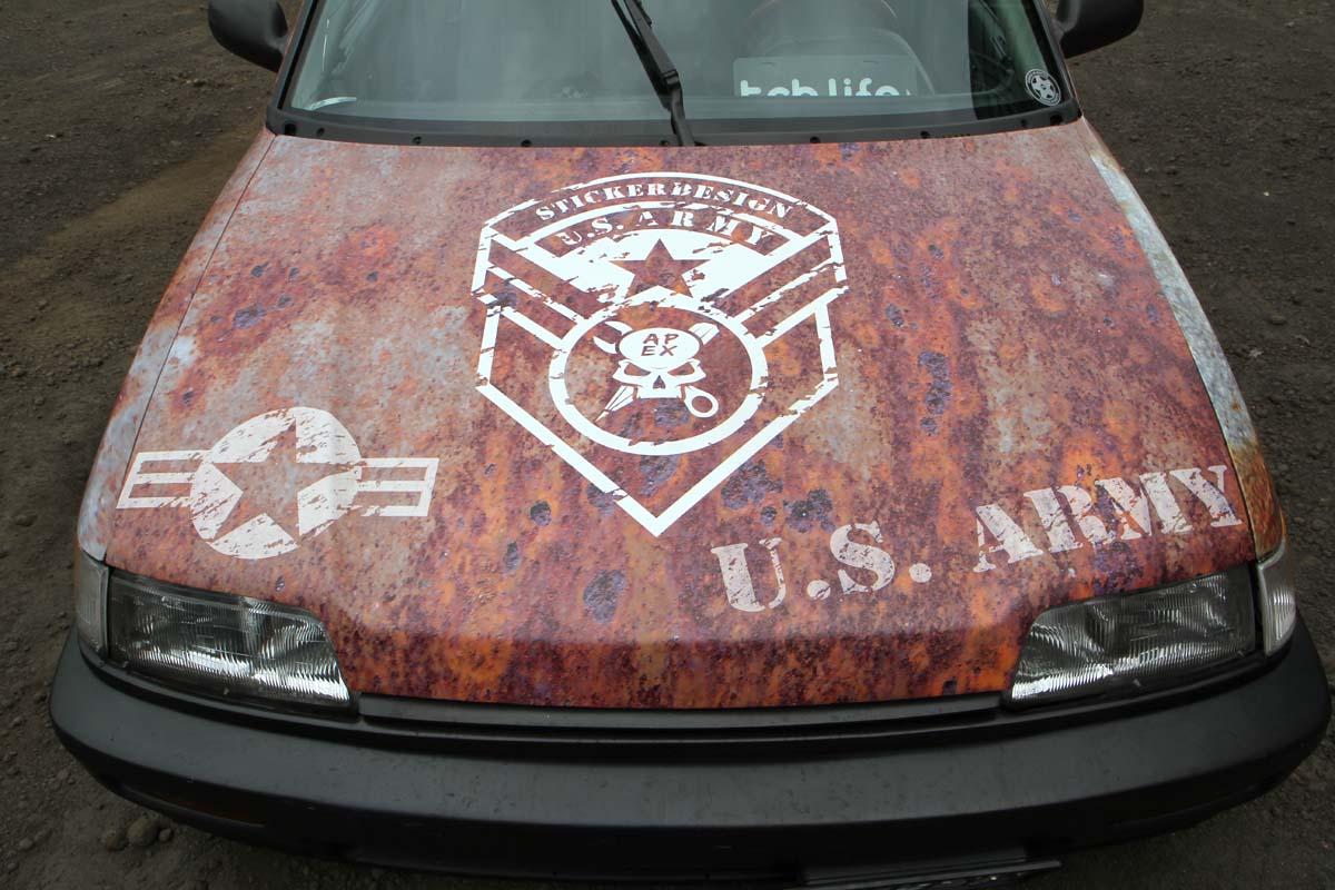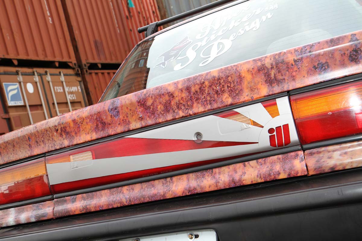 這部很容易被注意到的四代喜美,外觀上最大的特點就是車門旁的鯊魚彩貼,底色則為現在當紅的生鏽風,搭配車頂架、BBS輪圈與降低車高,充滿個性化的改裝車就這樣誕生。原本以為車上的彩貼是先貼上底圖,再拼貼上鯊魚彩貼而成,不過一問之下卻不是這麼一回事。據施工的緊繃彩貼包膜店的掌門人-洪正一表示,這部車的彩貼是先利用電腦繪圖軟體,設計出大小、位置與形狀都符合這車型後,再以印刷方式將圖案噴墨上去而成,因此整張彩貼摸起來是平滑的,優點是可節省施工時間,車洗起來也比較乾淨,不過卻非常考驗設計圖案者的功力,如果功力不夠,錯誤的圖案位置與大小,可是沒有重來的機會。
