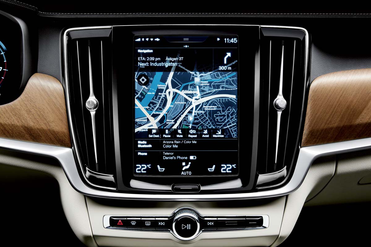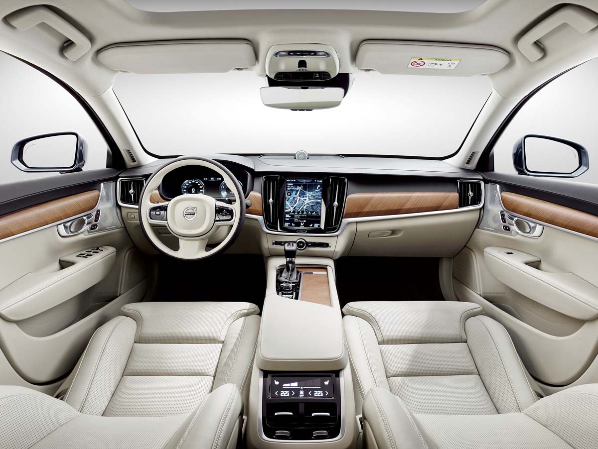 S90/V90車艙設計將北歐簡約風格與新世代智慧型科技元素完美融合,全車使用了米白色真皮包覆,搭配同色系座椅,以及木質紋路飾板點綴,令人彷彿置身於舒適的客廳,加上廣受好評的直覺式中控檯操作平板介面,車內所有可控制的介面都整合於其中,但卻不讓人覺得繁雜,操作起來無論直覺性與靈敏度都堪稱業界之最。