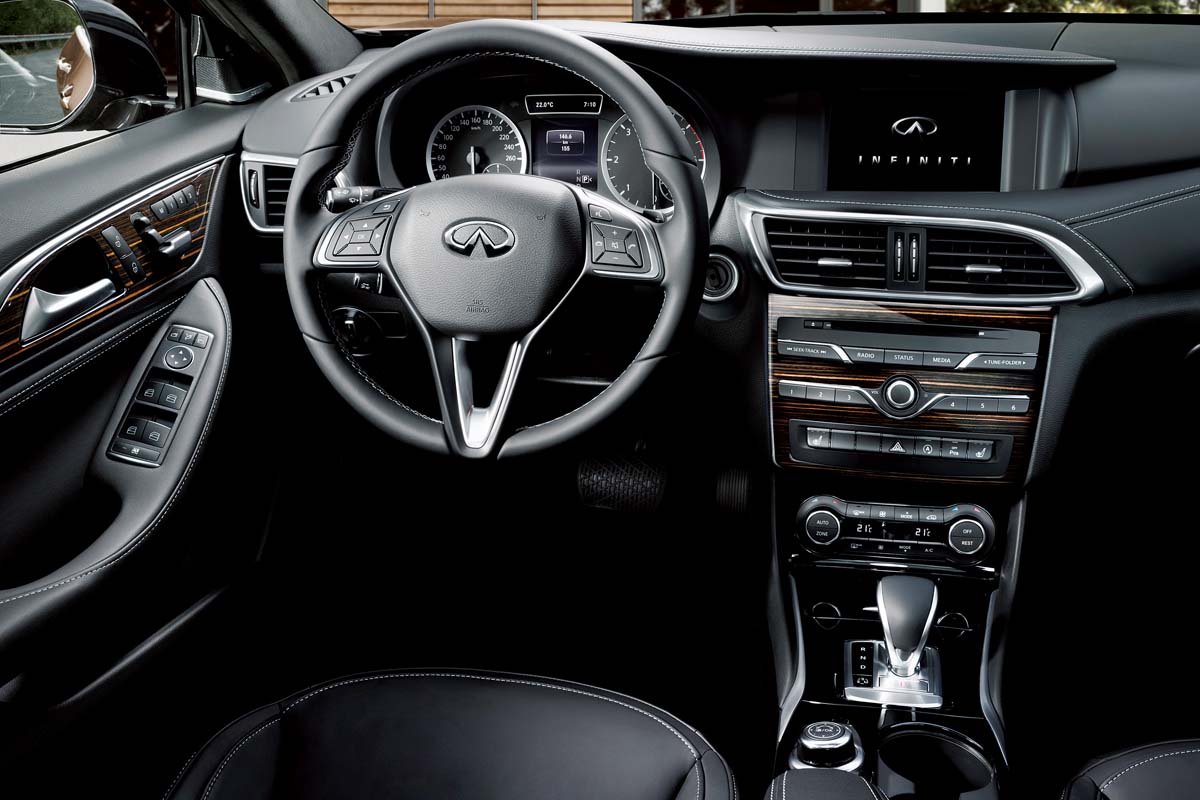 因此在內裝部分,Q30便帶來頗具高級感受的第一視覺印象,座艙不論儀錶平檯、車門扶手、門板等皆大量運用皮質鋪陳,在同級對手中確實有著較為傑出的表現,除此之外,Q30車頂採用Dinamica類麂皮頂篷,座椅也輔以真皮包覆,同時亦配置電熱功能。Q30也配置了Infiniti Intouch 7吋觸控螢幕,並搭配衛星導航系統及多項車輛資訊與設定,其餘雙區恆溫、後坐出風口、Bose 10具揚聲器音響系統、電子手煞車、全景天窗、LED頭燈等名列Q30配備陣容中。