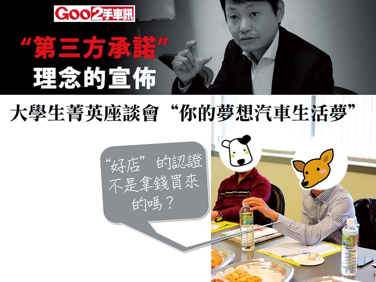 討論的後半場,大家非常關心中古車項目,多數年輕人的第一部車都是由中古車開始,所以對大學生來說應該是滿現實的問題。所以中古車行業一旦洗心革面,會使得很多消費者安心購買汽車,我們認為這使命十分巨大。有一位同學忽然提到一個問題 :「您們不是以好店的名義收客戶錢嗎?那會公平嗎?」這問題問得非常好。如果車商能花錢買到「好店資格」的話,媒體存在意義與改革都將成為空談。我這樣解釋,參加好店,除了有十分高的參加門檻外(七大承諾&全場鑑定),Goo 2手車訊長期對車商的觀察評估更是是否可以加入好店的基礎原則。簡單說,是我們選擇客戶,而非客戶選擇我們。