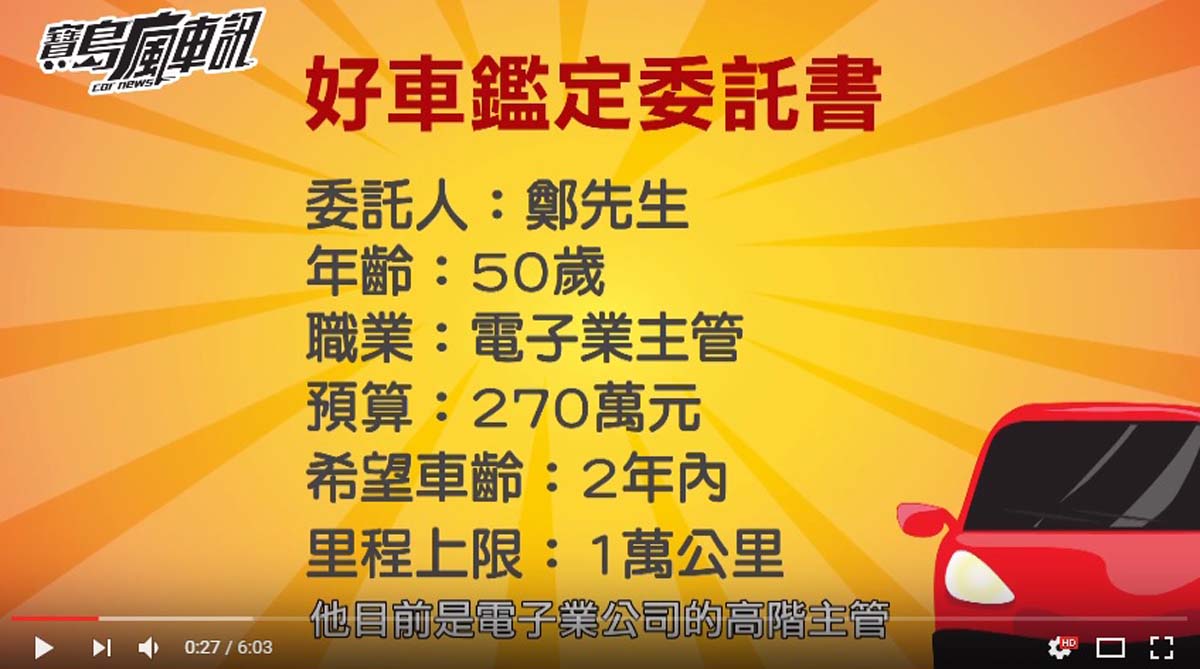 | 本次委託人鄭先生任職於某電子公司主管,收入穩定且擁有270萬元購車預算。 |
