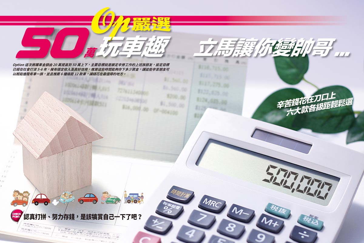 Option這次將購車金額由20萬提高到50萬上下,主要目標就是鎖定辛勞工作的上班族朋友,設定目標已經在社會打滾5-6年,擁有「穩定收入」及「良好信用」,推算這些時間能夠存下多少資金,及如何貸款才能將利率壓到最低,讓這些辛苦朋友可以輕鬆進階有車一族,並且推薦6種級距12款車,讓錢花在最值得的地方。