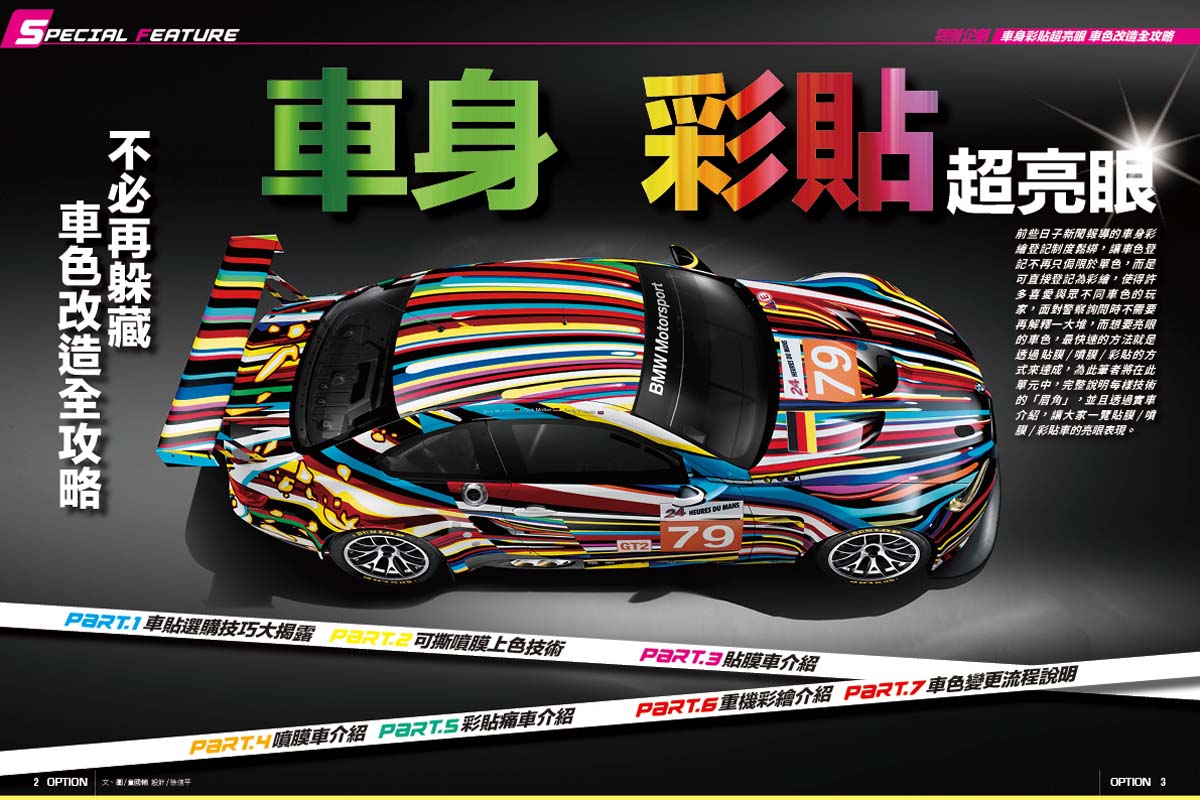 前些日子新聞報導的車身彩繪登記制度鬆綁,讓車色登記不再只侷限於單色,而是可直接登記為彩繪,使得許多喜愛與眾不同車色的玩家,面對警察詢問時不需要再解釋一大堆,而想要亮眼的車色,最快速的方法就是透過貼膜/噴膜/彩貼的方式來達成,為此筆者將在此單元中,完整說明每樣技術的「眉角」,並且透過實車介紹,讓大家一覽貼膜/噴膜/彩貼車的亮眼表現。