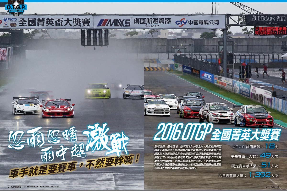 忽晴忽雨,乾地濕地,在不到12小時之內,天氣能夠瞬間轉晴天再轉暴雨,這樣極端的場景其實很少會在賽事進行中遭遇到,但是這回由於全台都受到尼伯特強颱與西南氣流的侵襲之下,因此極為惡劣的天候狀況除了嚴重影響OTGP賽事運作的順暢度,尤其在詭譎多變的天氣下,更是考驗車手判斷力及後勤團隊的應變能力,老天說變臉就變臉的風雲變色戲碼也替本次賽事增添許多可看性。