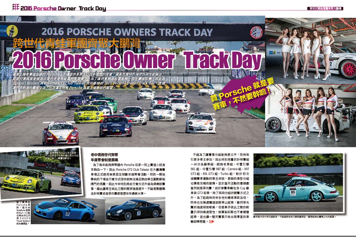 基本上擁有賽道血統的Porsche,不僅是許多男人心目中理想的座駕,優異而獨特的操控性與性能輸出,若是只單純拿來做為日常代步使用就真的太浪費了,為了讓許多熱血玩家能夠一同在賽道同樂,為此由Option、Bilstein與Porsche GT3 Club Taiwan共同舉辦的2016 Porsche Owner Track Day,透過激烈而刺激的賽道交流,一次滿足所有Porsche玩家上場廝殺的願望。
