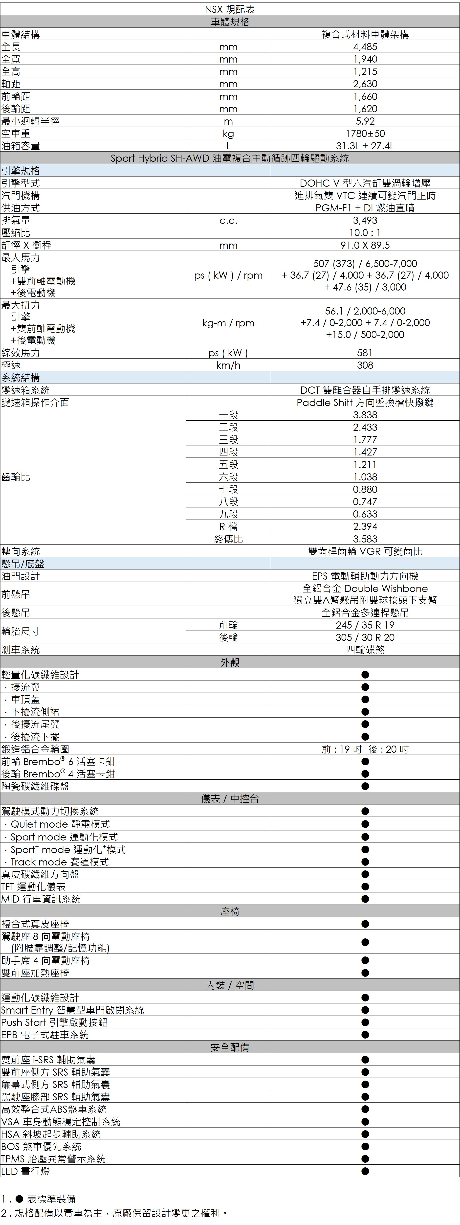 Honda NSX以新世代運動化油電超跑之姿,傳遞Honda堅持的先進創新品牌價值。憑恃滿載先進尖端科技、體現 Honda 「The Power of Dreams」品牌精神、重返頂尖超跑之列的-Honda NSX,自誕生以來便以全新思維與尖端技術倍受矚目,於 8 月 25 日以Honda頂尖科技展示平台之姿強勢登場。運動化四輪傳動油電超跑Honda NSX搭載多項世界首創、及Honda的頂尖性能技術,包括綜效馬力達581ps的3.5L V6 DOHC雙渦輪增壓引擎、統合九速DCT雙離合器變速箱和油電混合動力的 Sport Hybrid SH-AWD主動循跡四輪驅動系統、具備駕駛模式動力切換系統、融合最新製程的鋼材與鋁合金複合式車體結構與外觀輕量化碳纖維組件,同時以熱噴塗製程替代傳統鑄造汽缸套的新技術,有效降低重量並提升冷卻效率。讓最新的造車科技一次呈現在世人眼前。
