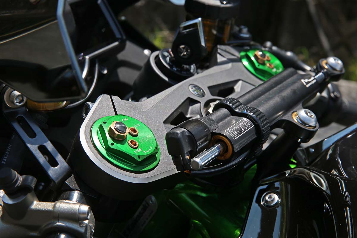 | KYB前避震器AOS II 競賽懸吊採用油氣分離阻尼系統,43mm 內管與阻尼設計提供相當穩定的路感,Ohlins防甩頭則是由ECU來控制強度。 |