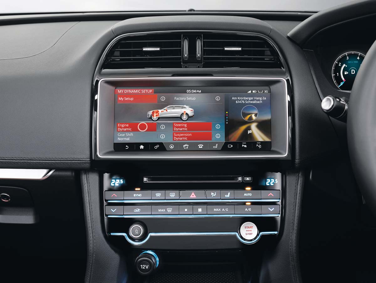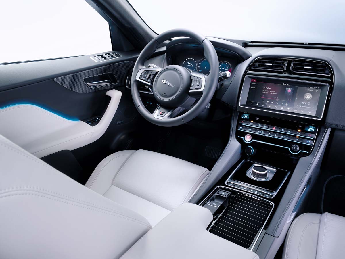 F-Pace除在座艙飾板具有質感外,配備陣容也相當講究,其中在安全方面,全車系標配ASPC全地面起步輔助、TvbB煞車控制扭力轉換、進階式循跡動態穩定控制系統與六氣囊等。而便利配備方面,為因應市場潮流,F-Pace則配置能顯示車輛資訊與全螢幕導航介面的12.3吋數位化儀錶板,中控系統也搭載品牌最新研發的10.2吋InControl Pro智慧多媒體全觸控式中控系統;如智慧手機般的操作介面與觸靈敏度,帶來更為輕鬆且直覺的操作感受。其餘如LED頭燈、真皮雙前座加熱座椅、Meridian 380W頂級音響、外接音源、衛星導航等皆有配置。
