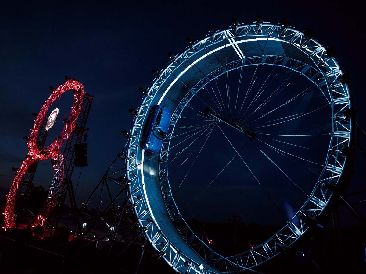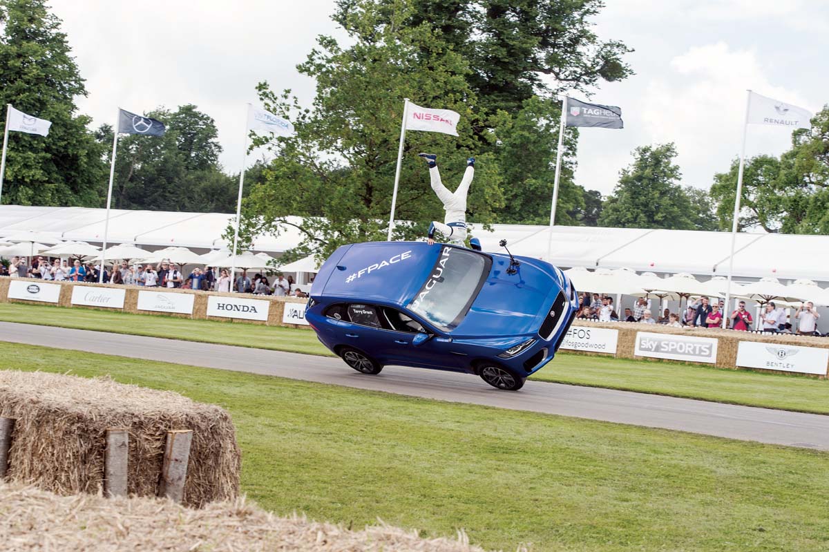 | F-Pace優異的操控本質,有著穿越高達19.08公尺環型跑道以及對抗6.5G重力與兩輪懸空的特技本事。 |