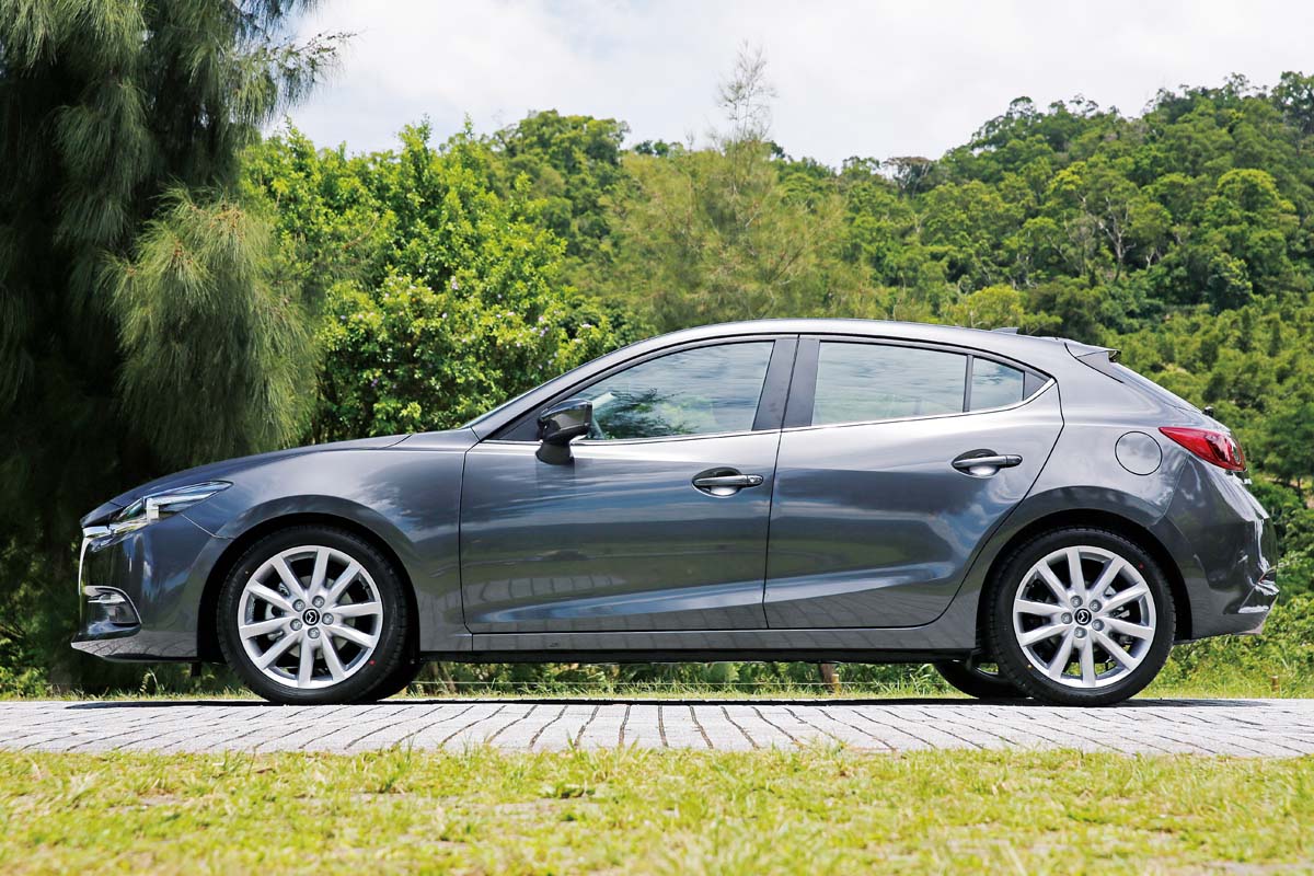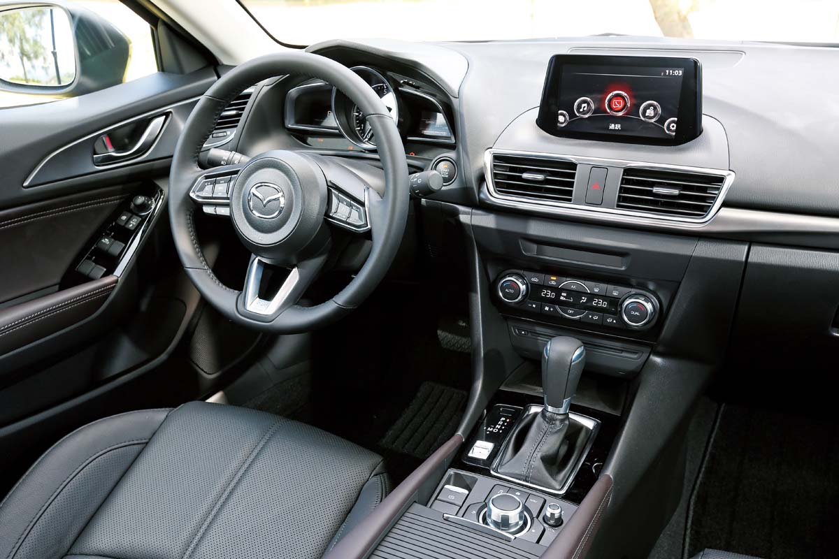 相較於許多車廠推出的小改款車型,時常只是改變容貌,增加一些配備便加價上市的銷售策略,小改款的Mazda 3雖然也有針對外觀進行小針美容,加大了水箱護罩的角度,同時換裝了新造型的LED頭燈組,整體看來和Mazda 6的相似程度更高,風格不再像現行車款那般年輕,多了一些成熟的韻味。至於車室內部的風格,Mazda 3也向老大哥看齊,中控及車門飾板都上了深褐色皮革包覆,同時將尊榮款以上車型所標配的7吋顯示幕重新設計,質感提昇不少。雖然衛星導航仍然列為選配項目,但可以跟新式的HUD抬頭顯示器連動,加入導航資訊、限速警告、BSM盲點提示等資訊,讓駕駛者更易閱讀,提昇行車安全與便利系。小改款後的Mazda 3推出了五門旗艦型車款(接單生產),增設了駕駛座電動座椅、BOSE環繞音響系統,更將車內喇叭增添至9組,強化車內娛樂效果。