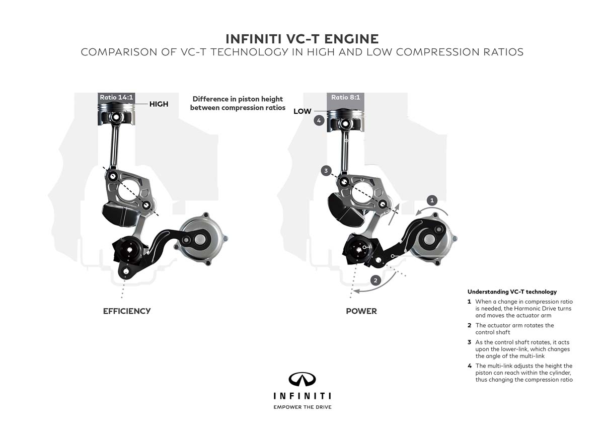 Infiniti近期在動力系統開發相當積極,除想在競爭對手中提昇自身競爭力外,另一方面也是想淘汰使用已久的大排氣量自然進氣引擎。對此先前已推出雙渦輪動力系統,如今則更進一步帶來2.0升、現行唯一具有可變壓縮比的VC-T引擎。此引擎於曲軸連桿處配置一具可動控制軸,藉由控制軸來改變曲軸位移,進而達到改變燃燒式容積,根據原廠表示 VC-T可變壓縮比引擎可讓引擎壓縮比在8:1至14:1之間進行改變,使其達到媲美2.0升柴油引擎的油耗水準。這具引擎目前雖未正式運用,但以Infiniti所帶來的資訊,應很快便會正式上線,而搭載的車型很有可能就是新一代QX車系。