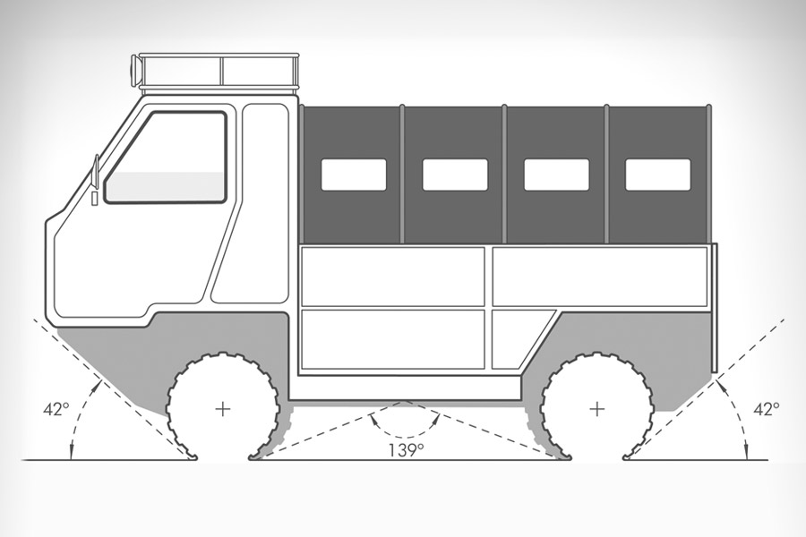 | 又寬、又高的離地間隙、 前面避震懸吊系統和簡單的底面。讓這車有超過 1 米以上的涉水深度 |