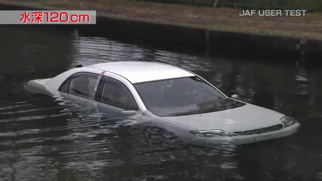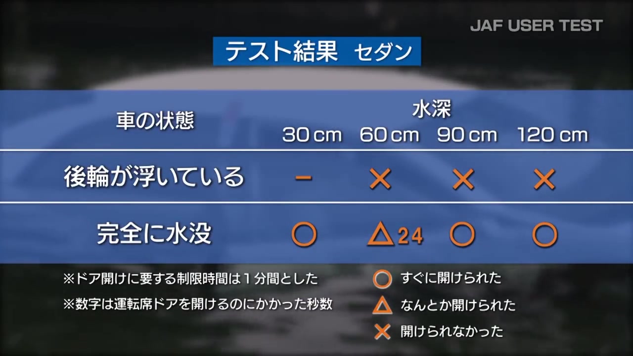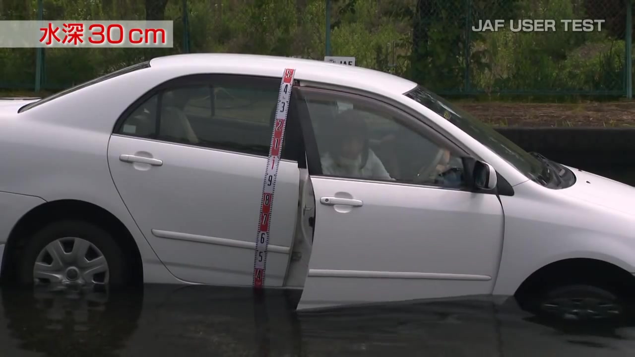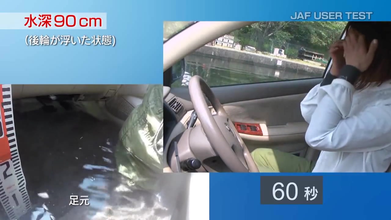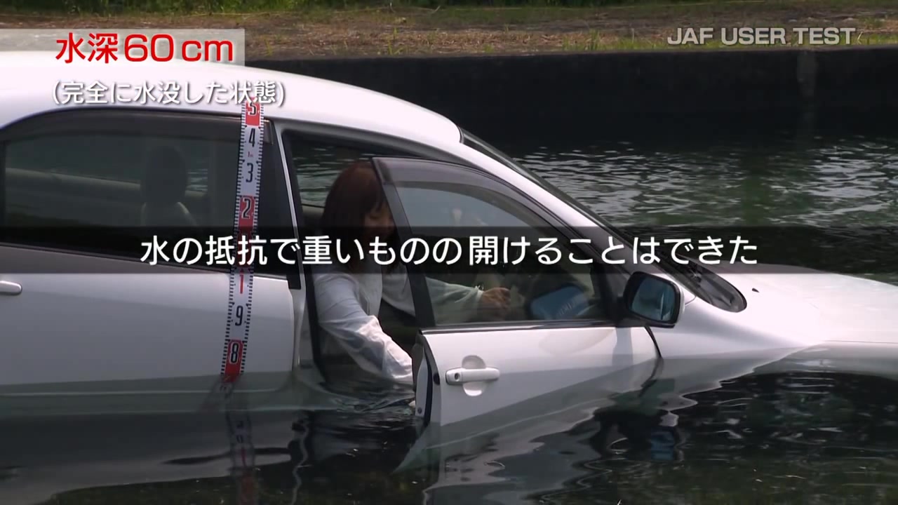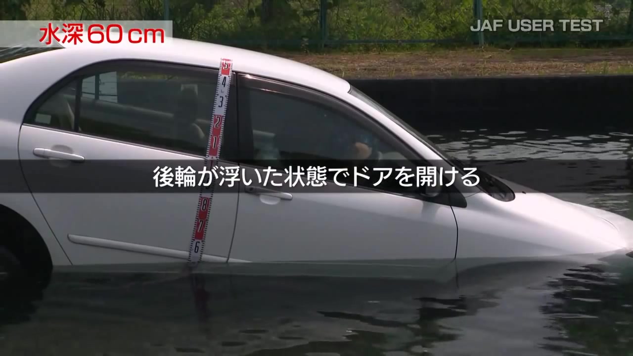 水淹60cm的狀況,後輪會浮起,這時開門很難,因為門很重,但等水慢慢進來,到浮起的後輪都接觸到地下之後,用力推門就打得開了