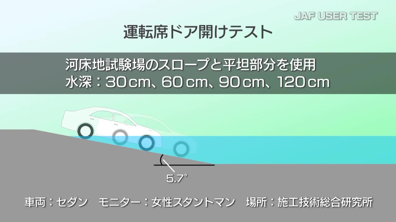 | 這實驗分別測試了30,60,90,120cm等,車輛在水中會碰上的狀況,可以讓人看出在水中,水進入車內的時間及會帶給車門的壓力 |