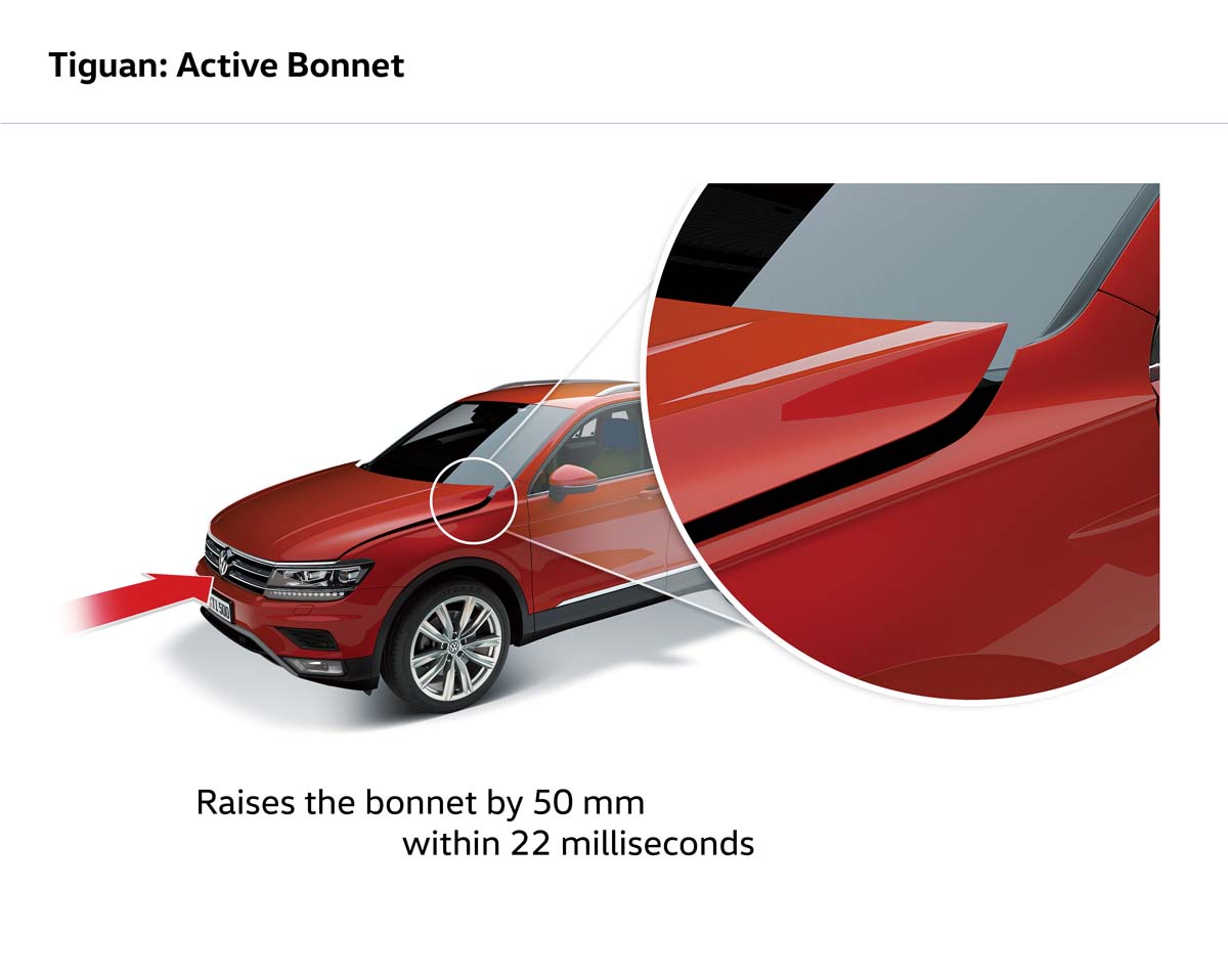 | VW對於行車安全的考量,不僅止於車內乘員,為保護行人及單車騎士,New Tiguan配備了主動式防護引擎蓋,透過保險桿上的感應器,在發生碰撞後能瞬即將引擎蓋後端升高50mm,以緩衝受撞擊者頭部與引擎室機件的撞擊。 |
