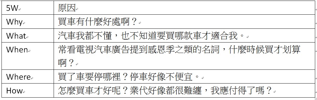 | 何謂5W,就是why、what、when、where、how,即便樂天開朗如Helen,買車前也是會遭遇相同的問題。 |