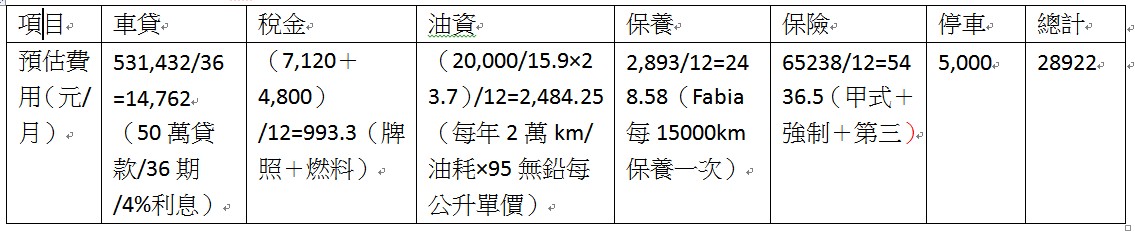 | 「貴桑桑」買車試算表(以Skoda Fabia 1.6MPI為例,車價68.8萬元) |