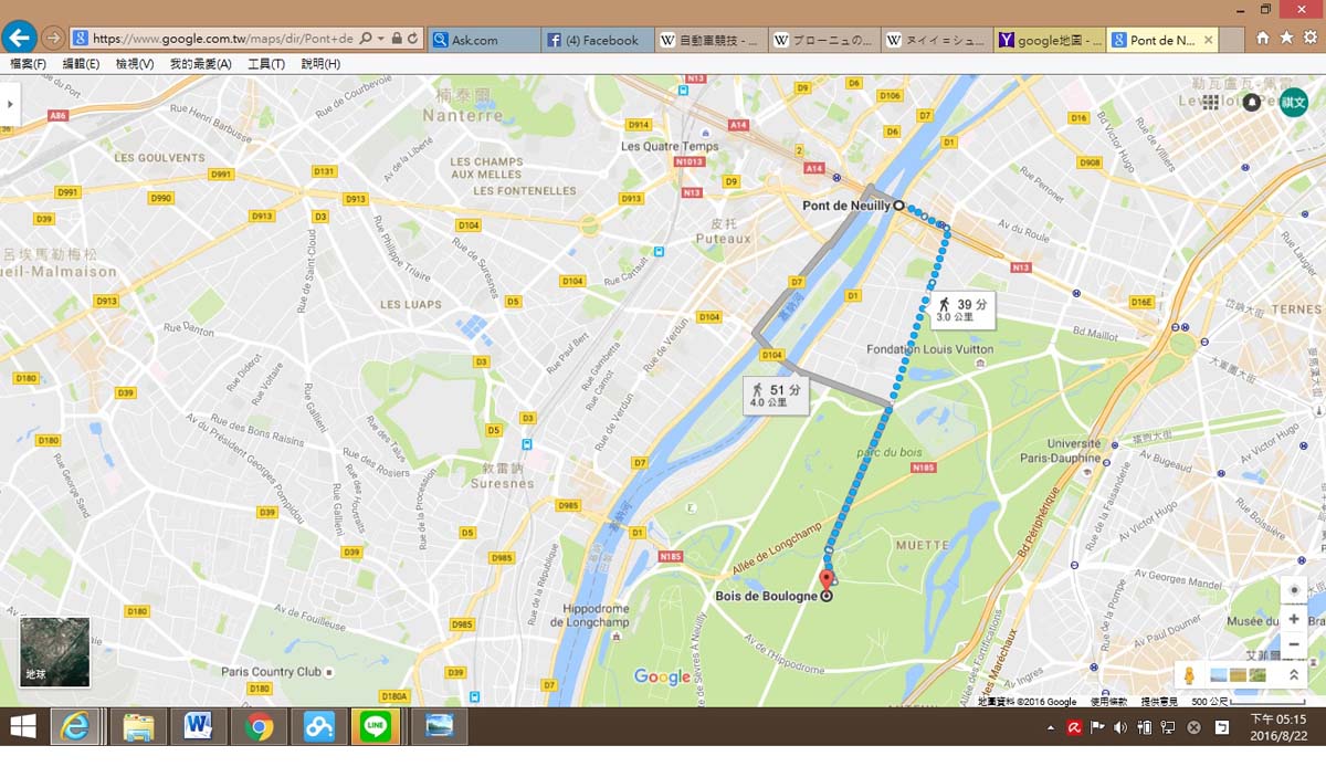| 非擁有正式紀錄的「萊茵橋」到「Bois de Boulogne森林公園」,單程約4公里的路程,成為了非正式紀錄的傳言賽事。 |