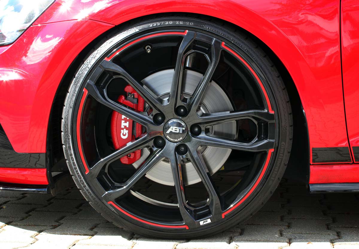 配合動力方面的進化,空力外觀方面ABT同樣提供前下擾流、頭燈罩、側裙,後視鏡蓋和後下擾流,加上雙出尾管以強調GTI性格活潑的面向。此外,底盤方面也可選擇ABT輕量化鋁圈,包含CR、DR、ER-C和FR,從8.5J×18-9.0J×20,而這些運動化輪圈也可搭配合適的高性能輪胎。為了強化操控表現,懸吊系統除了換上ABT高低可調套件,運動版前後防傾桿也提高操控極限,煞車方面則透過前六活塞卡鉗與370*35mm碟盤以提供理想的制動力。