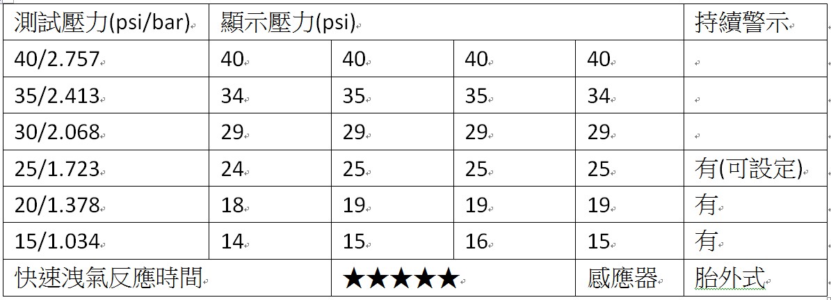 測試結果部分,則表現得中規中矩,各項數據的誤差值都在1psi以內,而最值得稱讚的特點還是在反應快速這部分,在筆者漏氣的當下,數值幾乎是同步變動,代表胎壓數值更新速度相當快速。