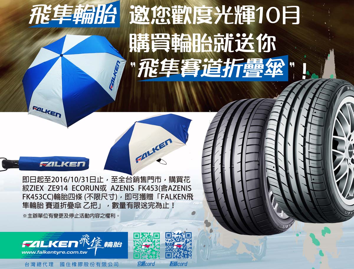 近年露營風盛行,假期是戶外旅行的最佳時刻!今天起就能以高CP值的產品、價格將愛車裝上飛隼輪胎,無論是房車胎或是休旅胎都能享有舒適、穩定、省油一次到位的感受,並守護全家人的行車安全。即日起 至2016/10/31至全台銷售門市,購買花紋ZIEX ZE914 ECORUN或 AZENIS FK453(含FK453CC)輪胎四條(不限尺寸),即可獲贈「FALKEN飛隼輪胎 賽道折疊傘 乙把」,數量有限送完為止! 主辦單位有變更及停止活動內容之權利。