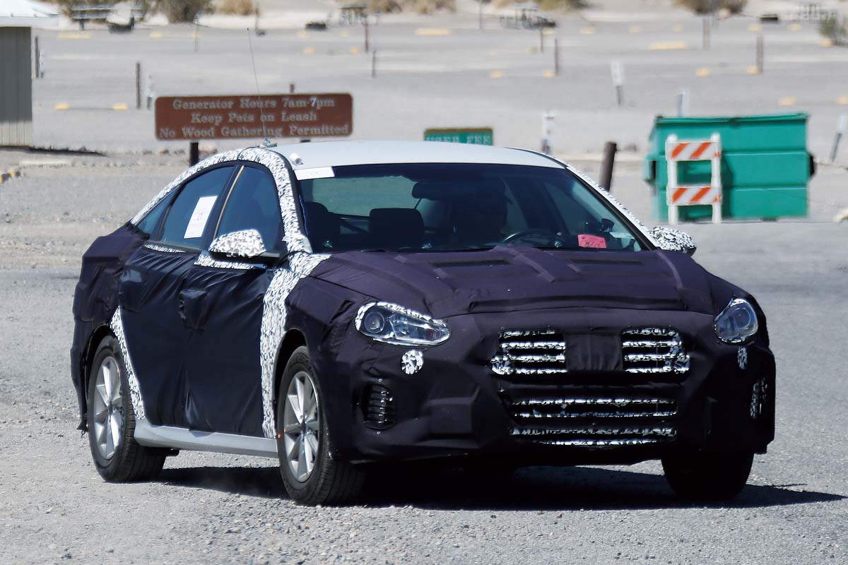 在炎熱沙漠中測試的Hyundai小改款Sonata,預計將採用更年輕且個性化的設計,線索可從品牌另一款房車Azera上發現。機械設定上將新增8速自排變速箱,以在性能與節能間取得平衡。令人興奮的是,小改款Sonata上有機會推出掛上N徽章的性能版本,馬力將大於美規現行的245hp,但究竟採用V6還是4缸引擎,則要到2017年後半才知道。