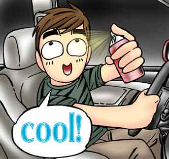 這款瞬間降溫噴霧劑的使用方式相當簡單,只需直接朝著須降低溫度的物體表面噴灑,即可在短時間內降低其溫度,之所以能有如此神奇功效,關鍵就在於分子高壓轉低壓時的吸熱現象。這些產品的內容物多半是高壓的純水與液態氮,由於分子在高壓轉換成低壓環境時會大量吸熱並蒸發為氣態,使周圍空氣溫度降低,因此若能使用高壓容器裝填上述物質,並噴灑於物體上,就能瞬間將物體表面的溫度帶走,達到降溫的效果,而瞬間降溫噴霧劑就是將這樣的想法付諸實行的產品。不過由於此項產品本身含有大量水分,因此不建議直接朝向真皮座椅噴灑,可採用間接噴灑於車內空氣中的方式,來降低車內高熱的溫度。