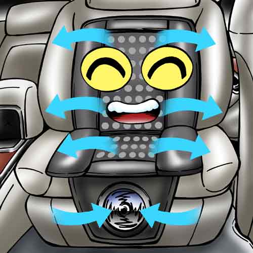 大家在長途駕駛時,是否經常遇到儘管當時的冷氣強度已相當不錯,但因座椅的散熱通風效果不佳而汗流浹背嗎?或是剛上車時,高熱的坐墊搞得自己如坐針氈嗎?沒關係現在有了這款涼風坐墊就沒有這些問題!從外型來看,這款產品與一般常見的通風坐墊沒有兩樣,在表面上一樣有許多細小的孔洞幫助臀部與背部通風散熱,不過其奧妙之處在於這款涼風墊不僅具有震動按摩的功能外,還能透過內部一具隱藏風扇,將冷風輸送到坐墊上的細小孔洞上,使乘坐在其上的人員背部有著更強的通風效果,達到前後通背涼爽的感受,就如同數百萬級房車般的高級禮遇。