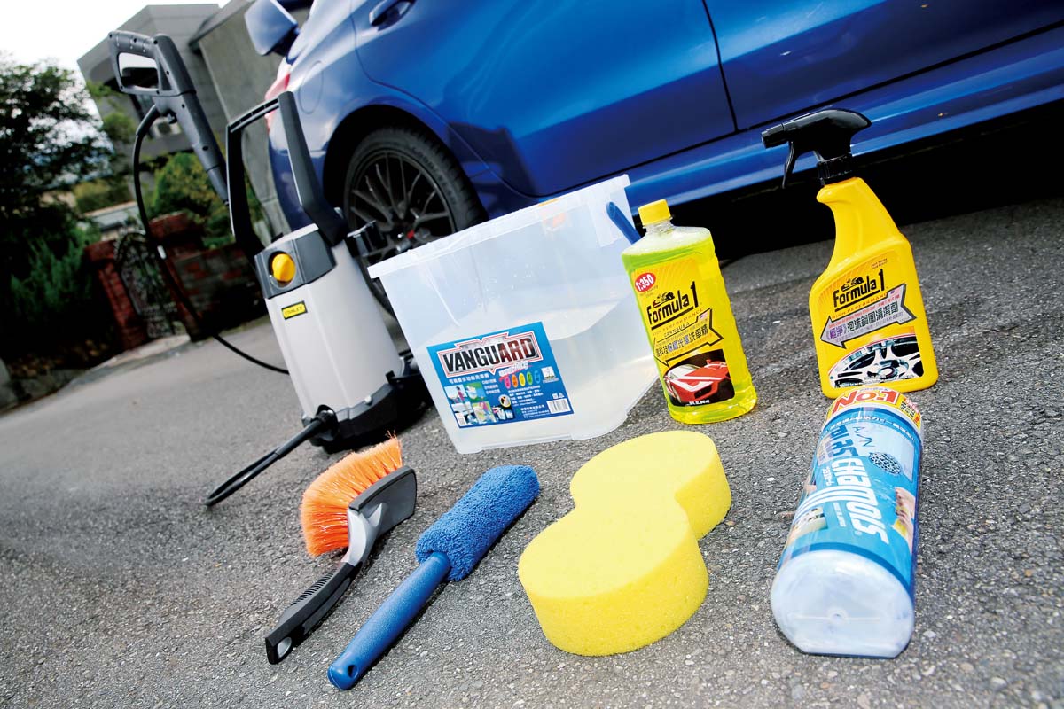 | 上排左至右,高壓水槍、可載重多功能水桶、洗車精、鋼圈清潔劑。下排左到右大刷子、小刷子、海綿、強效吸水的合成羚羊皮巾。 |