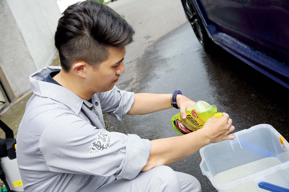 洗車前,必須先將洗車精調合完成。車主們可以到大賣場、汽車百貨等通路購買洗車精。現在市面上的洗車精幾乎都是濃縮的原液,必須用水稀釋過才能使用。建議將水裝在水桶後,再依據水量與比例倒入濃縮洗車精,這樣較方便控制正確的濃度。好的洗車精會加入活性界面劑,除了容易帶走泥沙,能不能輕鬆沖掉洗車精也是判斷品質的標準。以照片中Formula 1洗車精為例,原廠建議1:350約為半桶水對3瓶蓋的比例。