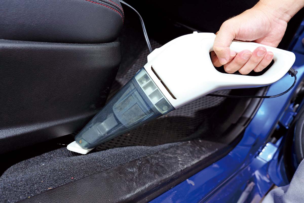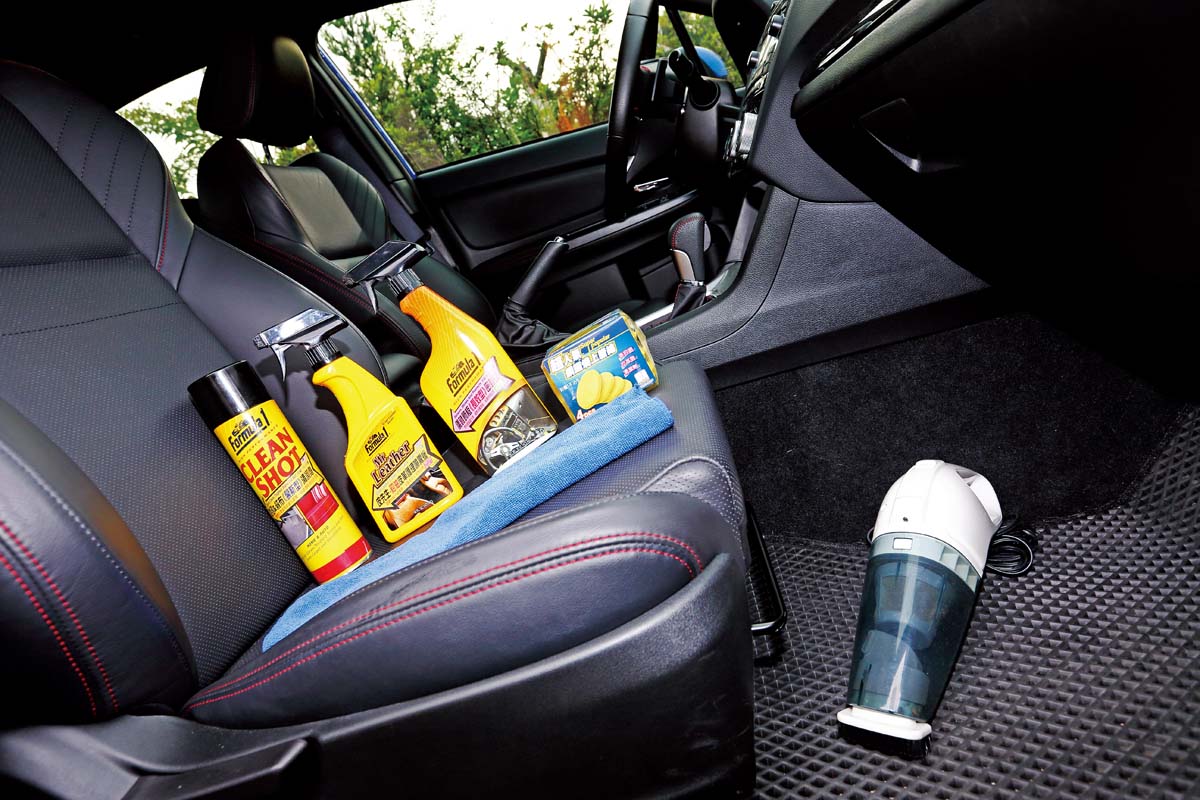 除塵時,先把地墊或止滑墊拆下來,把大面積灰塵抖落。然後透過車充吸塵器進行細部除塵作業,吸塵的要點很簡單,反正手不容易到達的死角,都可能是灰塵堆積處。最後再噴灑地毯絨布清潔劑,稍微靜置後再用濕布擦拭即可。雖然黑色內裝耐髒,但其實黑色的內裝往往最多細菌!