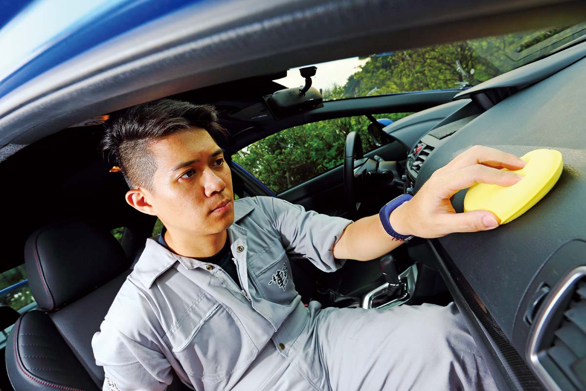 在駕駛艙的區域裡,我們先從最上方的儀錶板與中控檯飾板開始清潔,只要到賣場選購儀錶清潔保護蠟等相關產品,薄塗在海綿上擦拭清潔區域。一般而言,就能達到潔淨、防塵、防龜裂、甚至抗靜電等多重功效,有效延緩中控儀錶的老化時間。