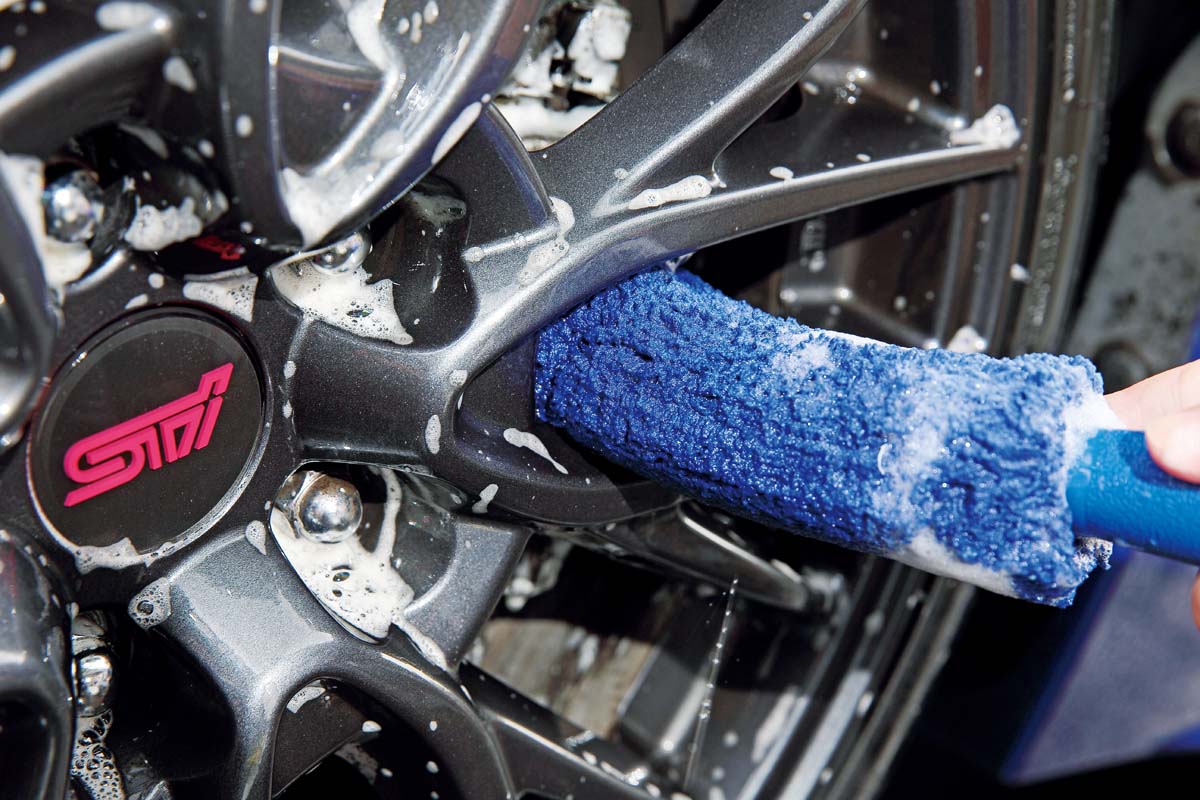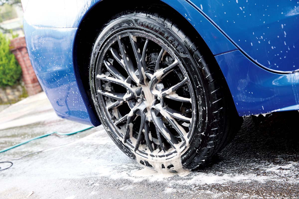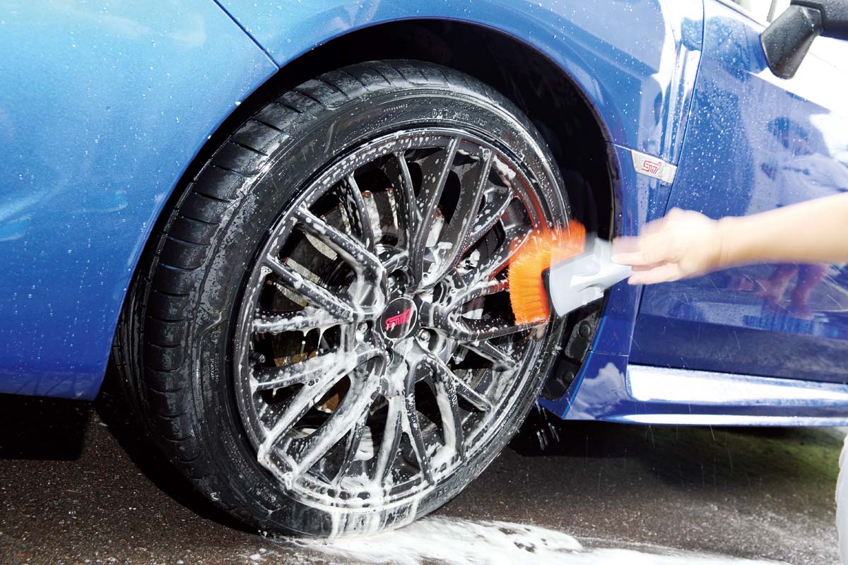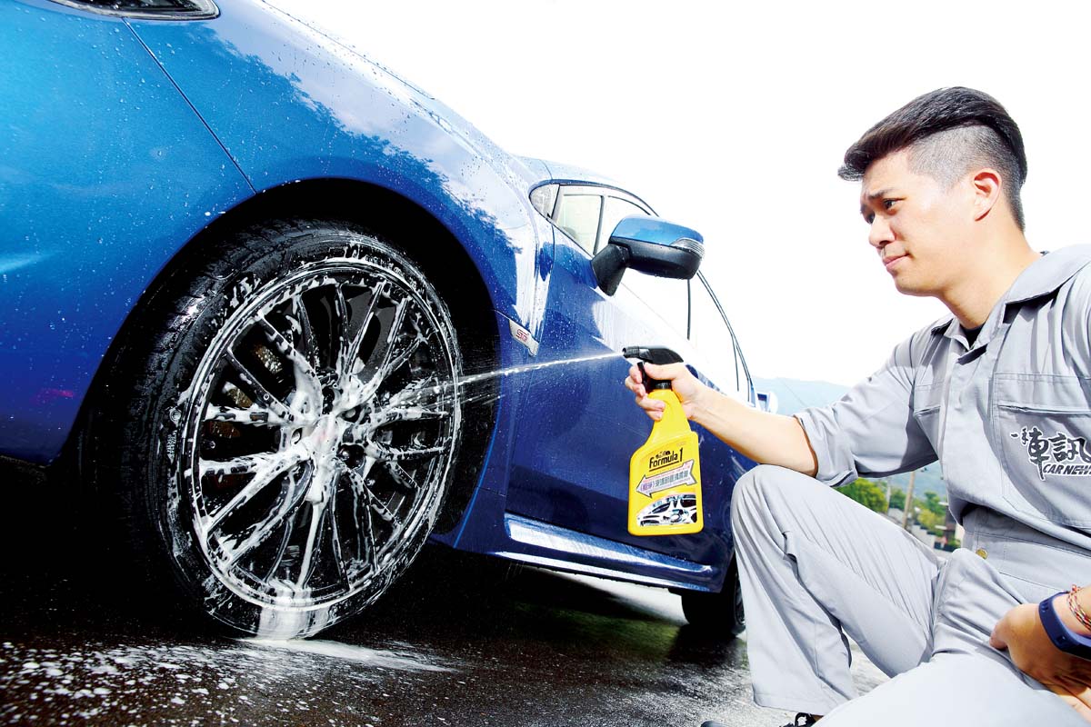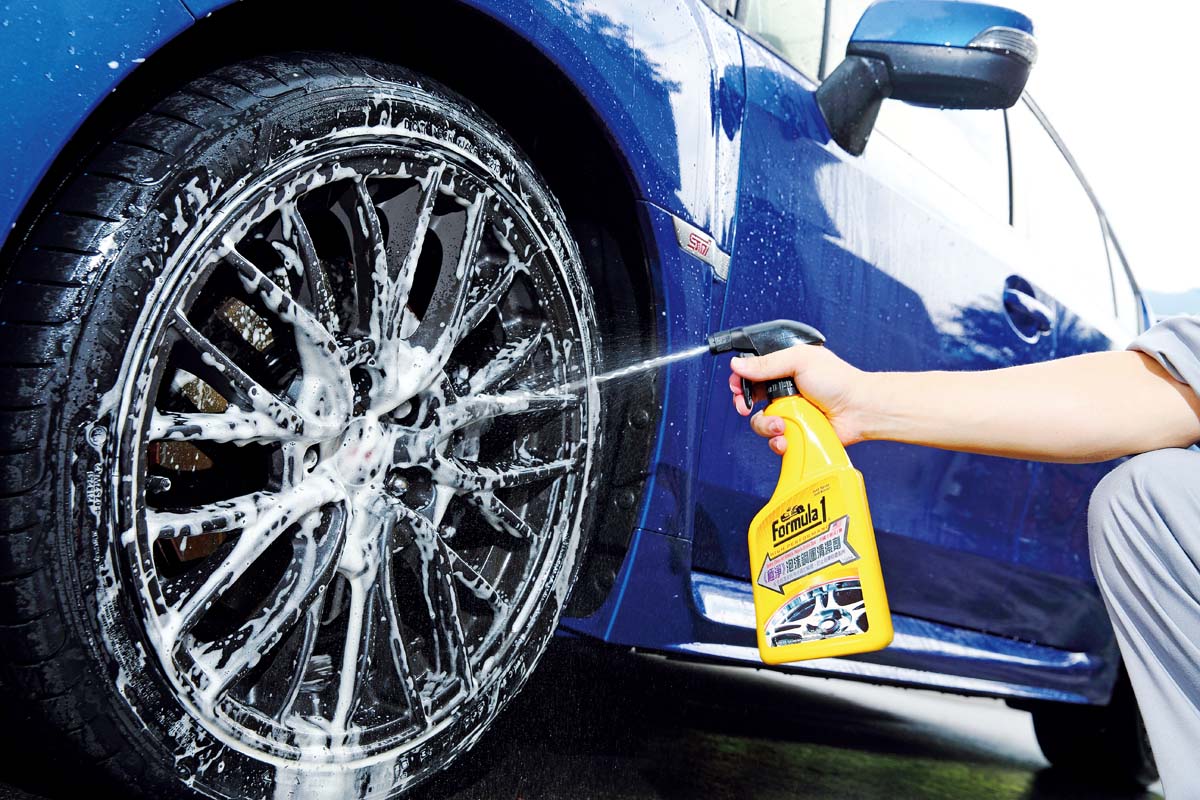 由於輪圈最接近路面,因此會比車身還更容易藏污納垢,殊不知只要輪圈乾淨便能帶來車輛亮麗的視覺效果。車輛在路上行駛車身下擾流、側裙四周會附著柏油等各種汙垢,而同樣靠近地面的輪圈加上造型設計更容易藏汙納垢,另外車輛在進行煞車時來令片與碟盤咬合會產生鐵粉,因此在行駛一段時間後輪圈會附上一層厚厚的粉塵,而這種粉塵卻無法單用清水或是泡沫就能徹底清潔,此時便須使用輪圈專屬清潔劑。但也並非噴上清潔劑隨意沖洗就能乾淨,正確的清潔步驟要先將車身沖濕,接著將輪圈噴上專屬輪圈清潔劑讓清潔劑溶出柏油鐵粉,待四輪均勻噴塗後便可進行清洗。由於清潔劑會附著於粉塵,因此只要用輪圈刷或海綿便能輕鬆清除頑固骯髒的粉塵,若是輪圈造型有狹小縫隙,則可用輪圈清潔棒進行刷洗,最後再用高壓水柱將輪圈徹底沖洗乾淨。