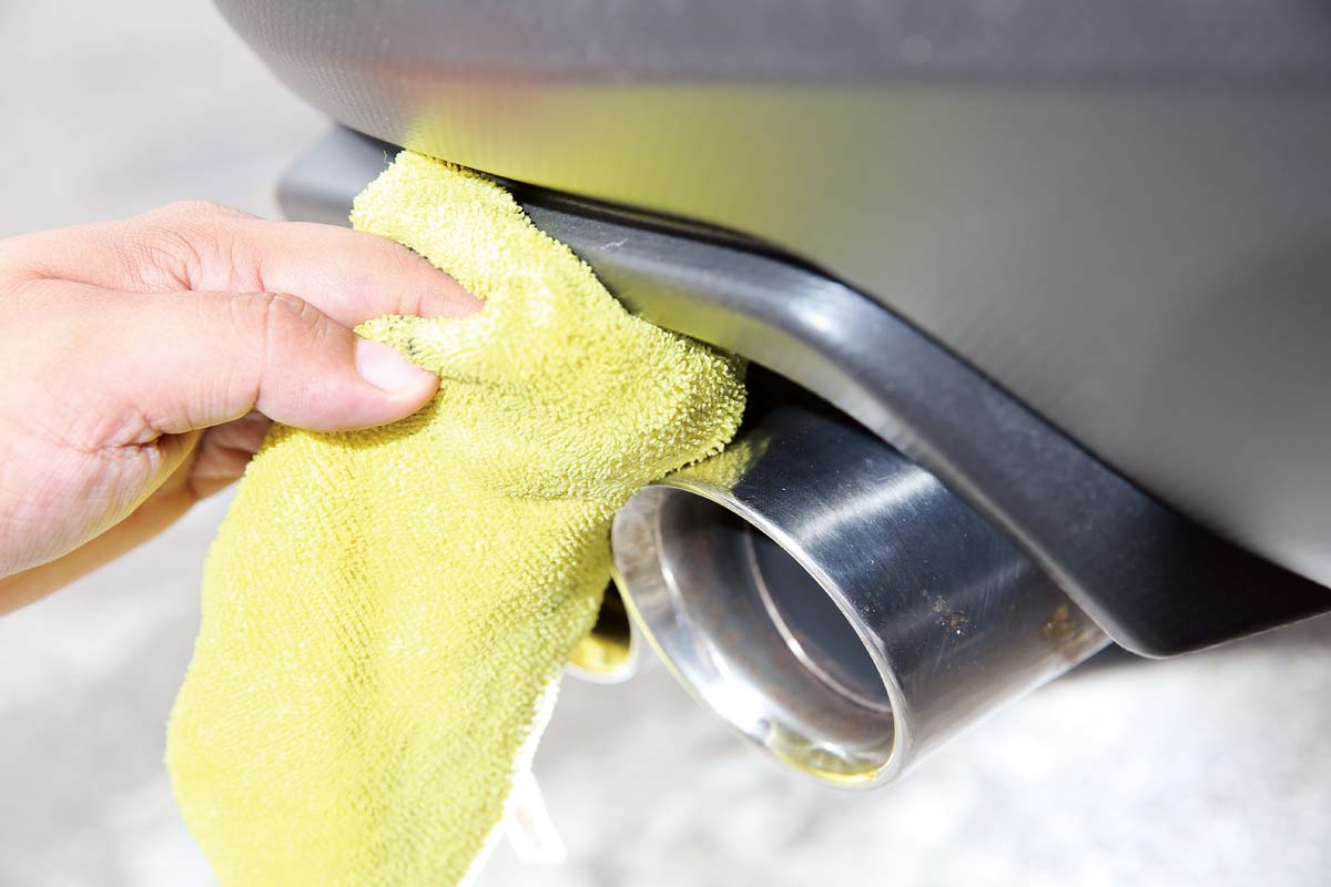 | 車身上除了烤漆與塑料鈑件之外,佔最大多數的便是鍍鉻等金屬材質(如排氣尾管),待冷卻後將其洗淨,再使用金屬專用的擦拭劑清潔 |