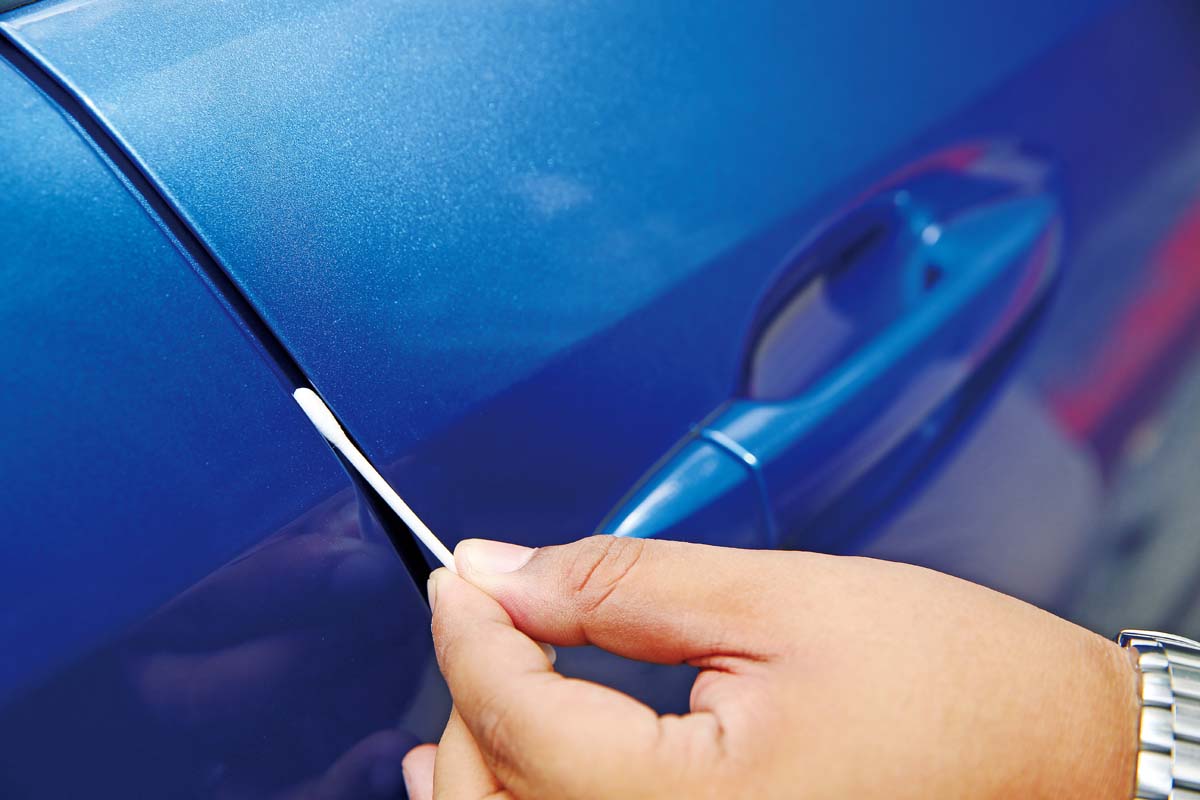 | 車輛外觀是由不同的鈑件組合而成,自然也有相當多的接縫處,在上蠟時可能一不注意便會將蠟塗抹進縫隙中,此時可以使用棉花棒將縫隙內殘餘的車蠟清除。 |