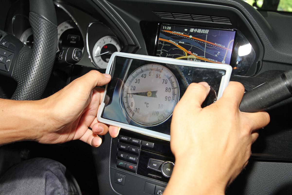 | 針對冷氣系統的檢測,則是開啟冷氣,將溫度調至最低,同時以溫度計測量冷氣出風口的溫度是否降至合理範圍,並且會拍照下來,附在鑑定書上給消費者參考。 |