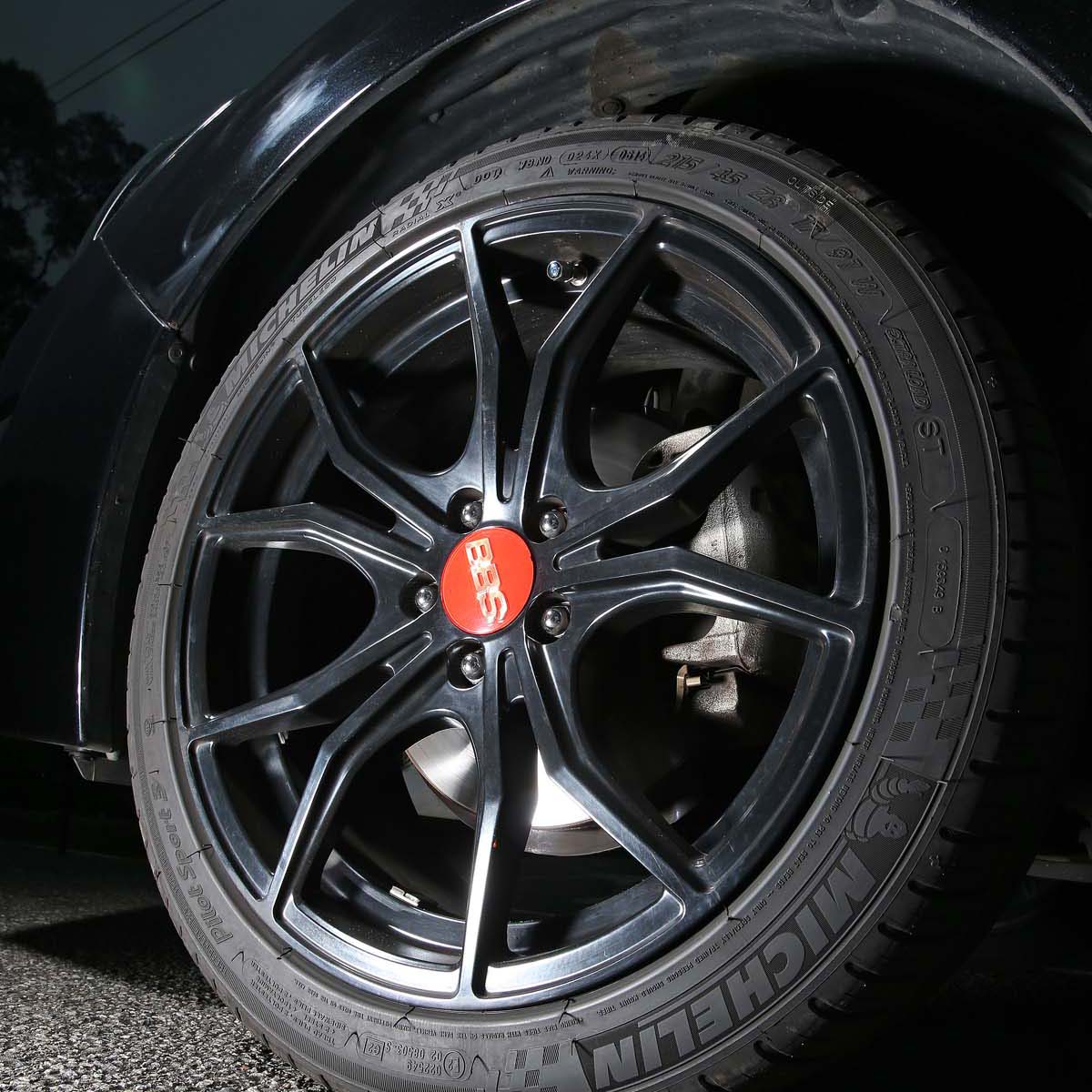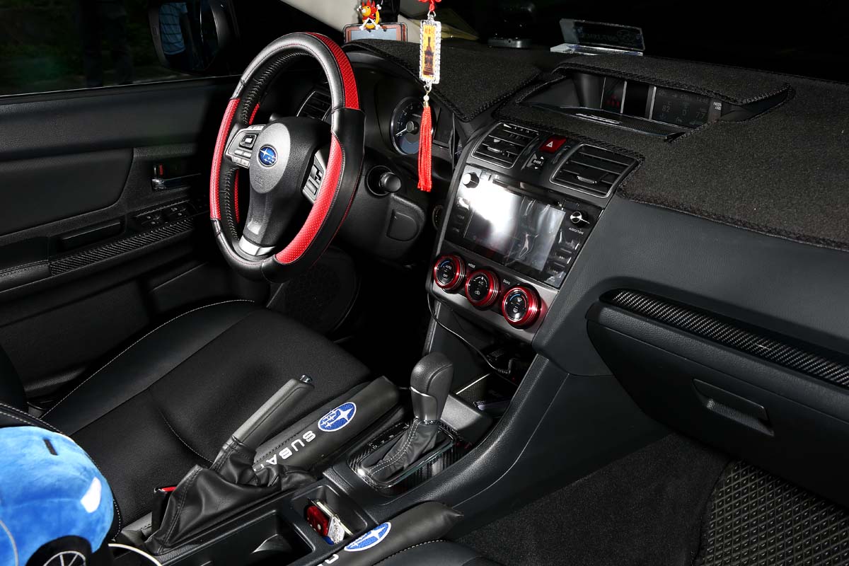 為了搭配車主所設定的紅黑內裝,方向盤皮套採用紅黑配色,空調旋鈕也改為紅色白鐵製品,內裝只有這兩個地方是紅色,因此顯得格外搶眼,此外,呼應外觀所採用的碳纖維風格,內裝飾板也採用碳纖維重新包覆,呈現黑壓壓的神祕感。車主將改裝重心放在外觀與內裝上,自然對於動力與底盤的訴求較低,引擎室中唯二的改裝品就是Cusco引擎室拉桿與煞車頂桿;至於底盤部分,避震器、煞車系統皆為原廠設定,僅改裝17吋鋁圈搭配Michelin Pilot Sport 3輪胎,尺寸仍是常見的215/45 R17。