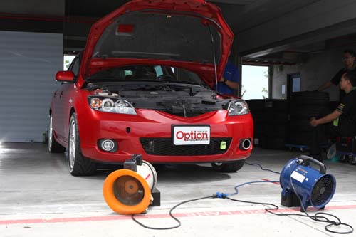 | 每款輪胎測時都會間隔一個小時的時間再進行,目的在讓車輛有充分時間休息,這段時間內還會使用兩具強力風扇,針對煞車、水箱與引擎本體進行強制散熱,讓溫度快速降低,以減少熱衰竭的情況產生。 |