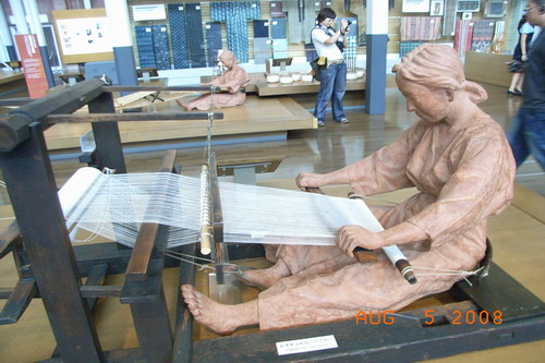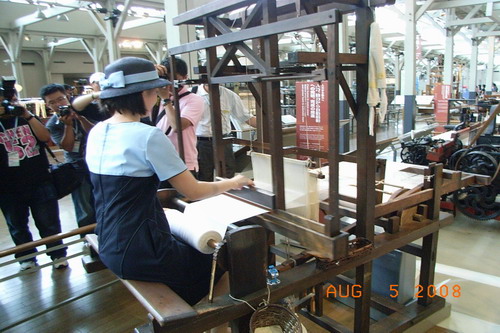 | 這是豐田佐吉第一部發明的「人力織布機」。現場亦有美麗的解說人員親自示範如何將利用來回移動的「梭」來將紗線織成布疋。 |