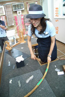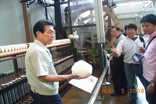 | 在纖維機械館裡展示著豐田歷年來重要偉大的紡織科技,同時館內有各式各樣的紡紗機和織布機供參覽,並且有親切的解說人員親自操作示範。而此位解說員正在為大家示範如何將棉花變成紗線。 |