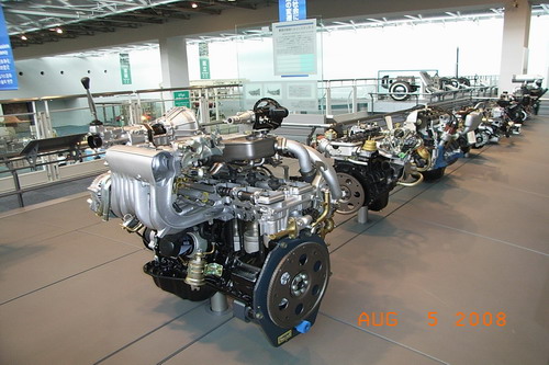 | 在自動車館裡,亦陳列了豐田汽車自行研發製作的各款式引擎,從直列四缸、直列六缸、V型六缸、V型八缸等作動過程。 |