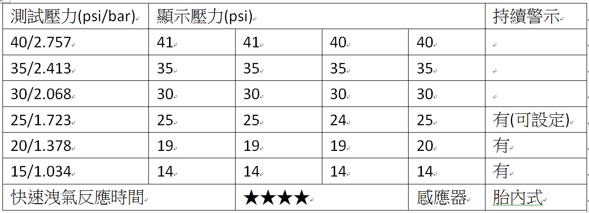 測試結果部分,從數值的表現來看,雖然在40psi的測試壓力中,有兩顆感應器出現些微誤差,不過在最常使用的到25-35psi的壓力值間,卻相當精準,可提供安心的監測功能,加上該有的警示功能與反應速度都在水準之上,整體表現相當不俗。