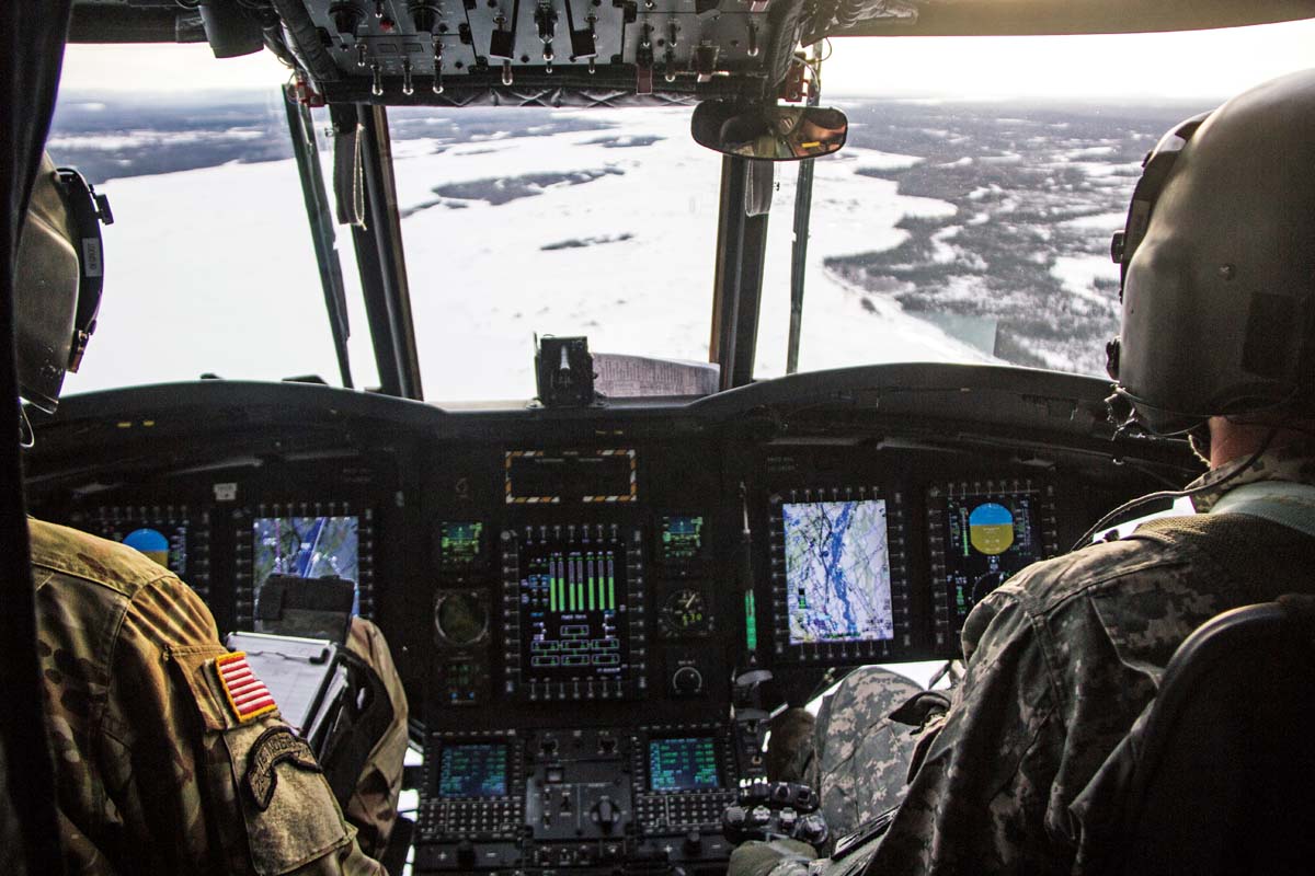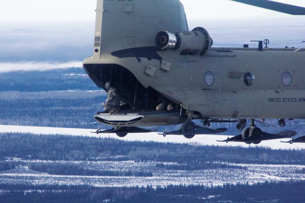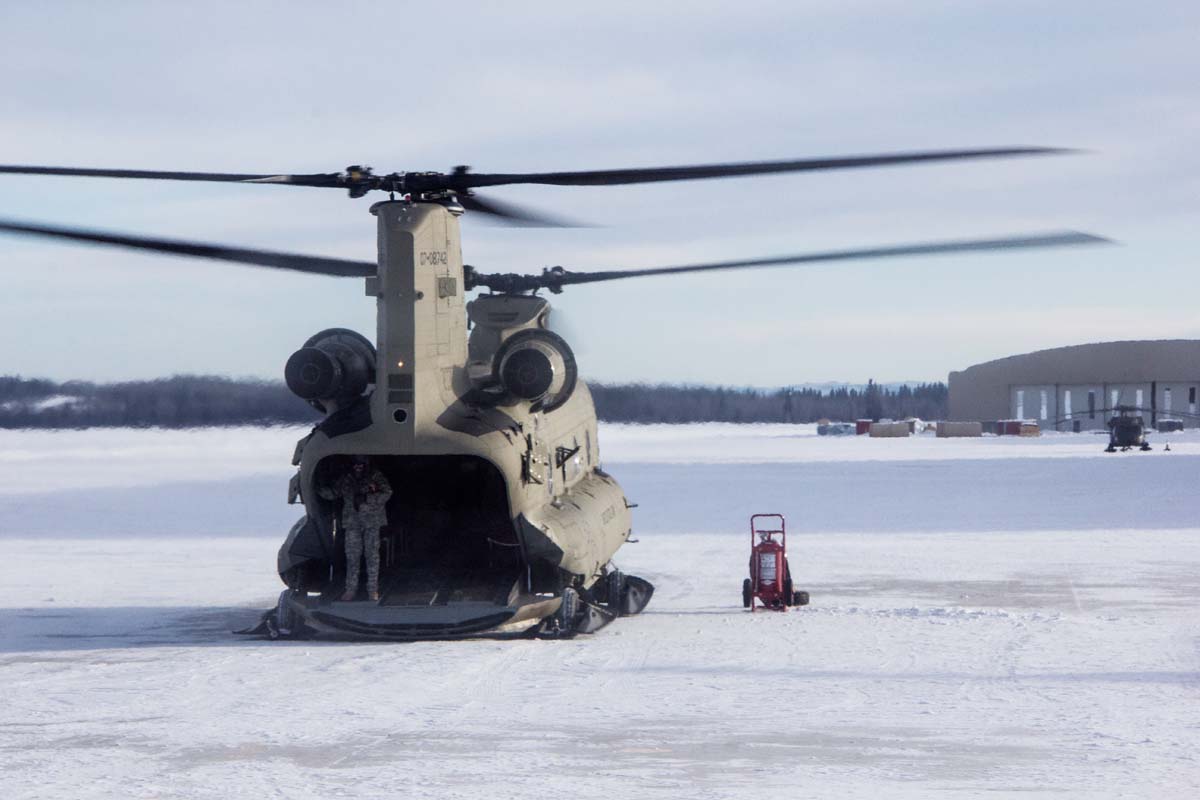 除了高緯度帶來的嚴寒之外,阿拉斯加多山的地形也是另一項地理特色。可不是什麼直升機都能在零下59度、風速超過60km/h的環境下,輕鬆往返海拔6100m山區。這時候就必須仰賴一項美國陸軍特有的乘載設備:CH-47契努克直升機。這架重達13600kg的直升機,擁有兩具渦輪軸發動機,最大馬力可達10138hp。透過縱列式雙旋翼設計,能夠不依賴機尾側旋槳,就達到離心平衡,減少15%的動力損耗,所以能換來更強大的乘載與升空能力。由於直升機噸位驚人,螺旋葉片也重,重量達163.3kg的葉片,在平常不運轉的情況下,極可能下垂掃到機身。所以不論降落葉片減速、起飛前葉片加速,都必須在極短的時間內完成,這時候若遇到側風,可就危險了。