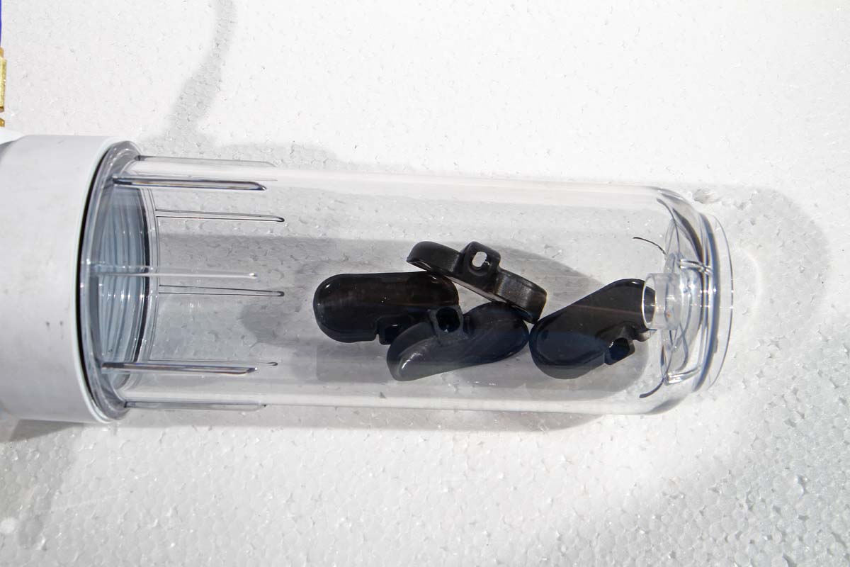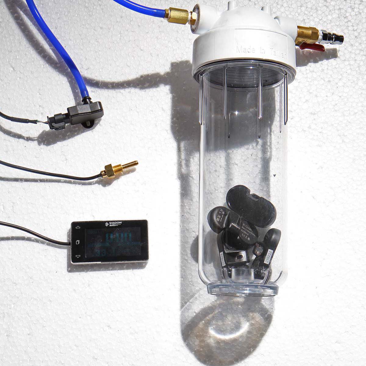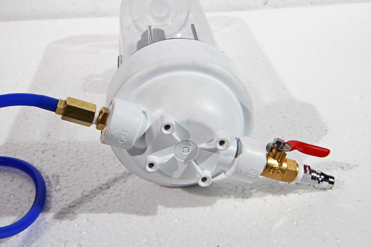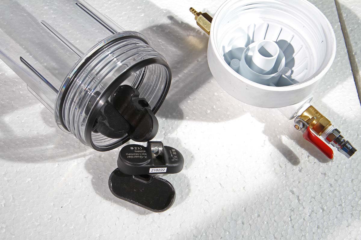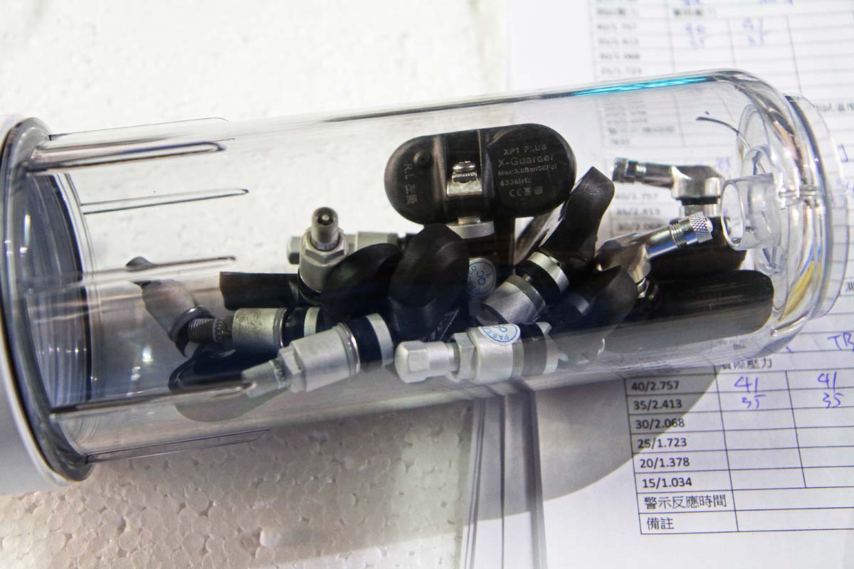 至於該怎麼測試呢?關於這問題也讓筆者煩惱許久,原本在找不到適合的抗高壓容器下,已打算耗費更多時間實際拿輪胎打氣來測試,後來在好友協助下,終於向國內專門製造逆滲透水質過濾器的大廠-普家康,要到可瞬間承受120psi壓力的透明濾芯外殼,用來應付40psi以下的氣體壓力環境綽綽有餘,如此一來測試每款胎壓偵測器產品時,只要將胎外/胎內感應器丟進去濾殼內,關緊蓋子同時灌入高壓氣體,就能模擬輪胎內的高壓環境,讓測試更快速精準,也解決了原本應該要頻繁換胎才能進行測試的窘境。