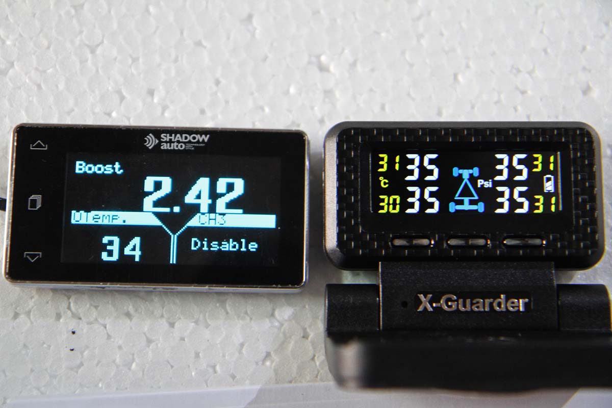 而用來當作壓力對照準位的顯示儀器,原本已買了機械式壓力錶,但後來發現精準度不高,每個刻度是2.5psi,想要準度高一點的壓力錶一時間也找不到,很難當作檢測儀器,最後決定用國內電裝品大廠-Shadow,推出的FD多功能顯示器中的渦輪錶,來當作為正確的壓力對照錶,雖然單位是bar,但經過換算後不成問題,且採用車規電子式壓力感應器的設計,精準度又可到小數點後第二位,且大廠對產品品質的要求亦值得信任,對於壓力敏感度與準度會比機械式壓力錶好上許多。