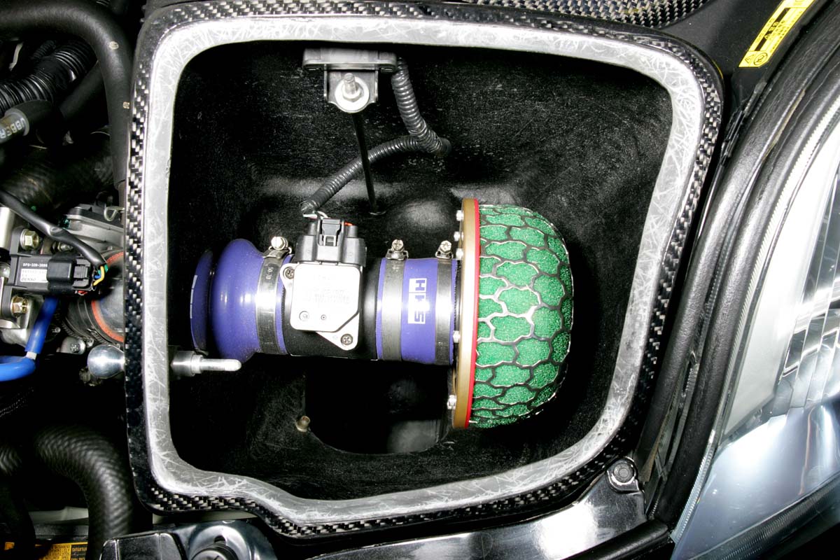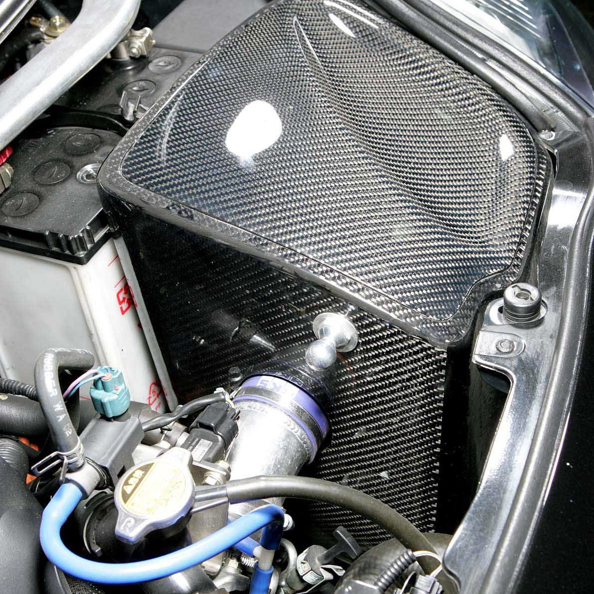 | 有些做工細膩的店家,還會替香菇頭手工打造放置的碳纖維集氣箱,目地也是在隔絕引擎熱氣,並且將車頭較冷的新鮮空氣導引至集氣箱內,如此改法會比香菇頭直接裸露在引擎室內吸熱氣來得有效許多。 |