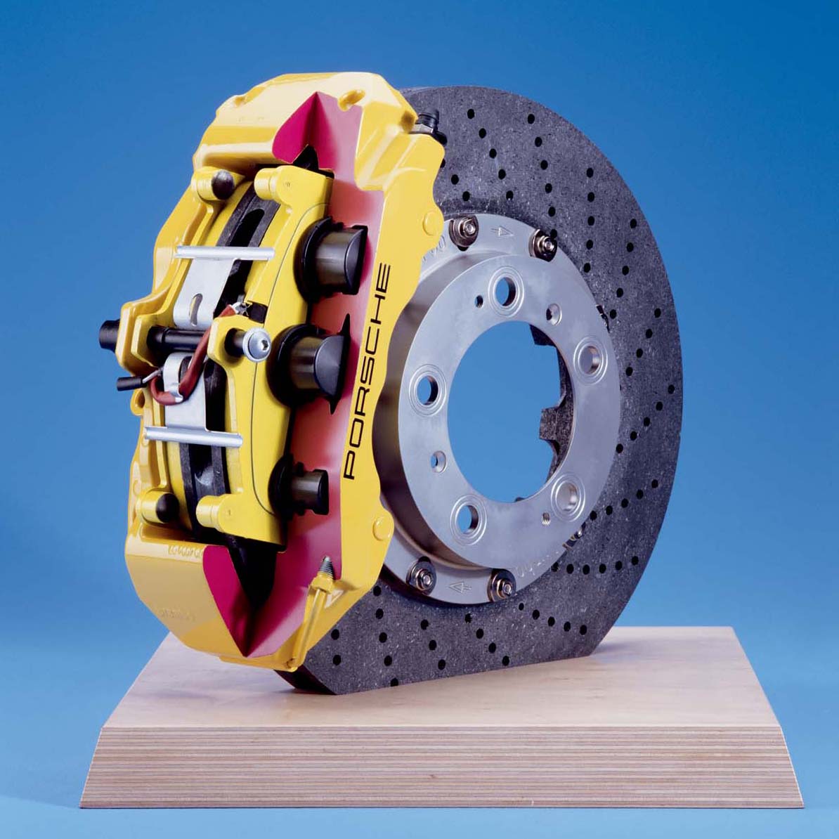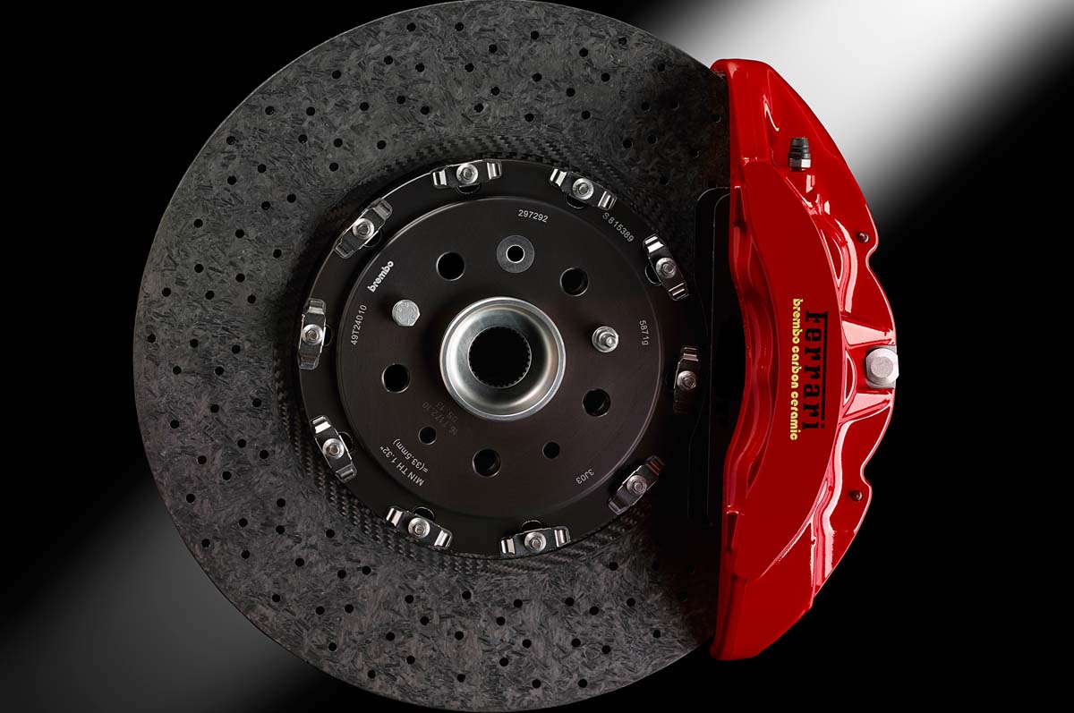 | 市售車中等級最高的煞車系統就屬陶瓷複合煞車碟盤,其構成原理是將來令片與碟盤的角色互換,因此不只有極高的耐熱性,還能重量超輕,二片碳纖維碟盤等於一片鑄鐵碟盤,較相同結構設計及尺寸之標準材質碟盤足足輕了約 50%。 |
